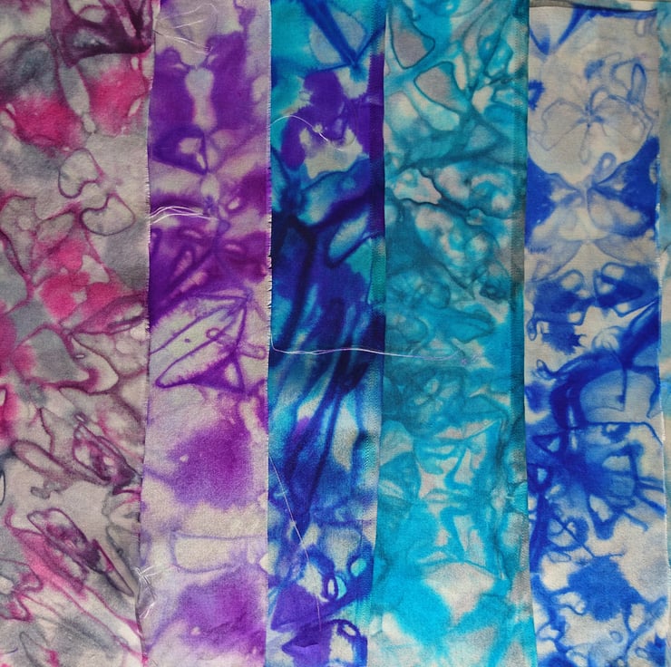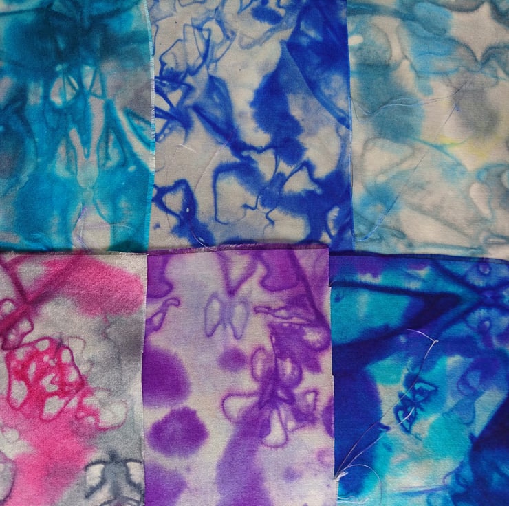 Gorgeous super soft silk - hand painted using steam set dyes. The silk is a medium weight Habotai 8 which I have cut by hand and dyed each square individually so that each one is different. They would be fantastic for all sorts of fabric crafts.