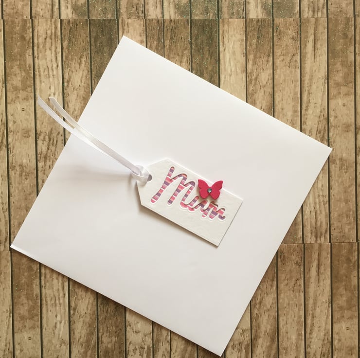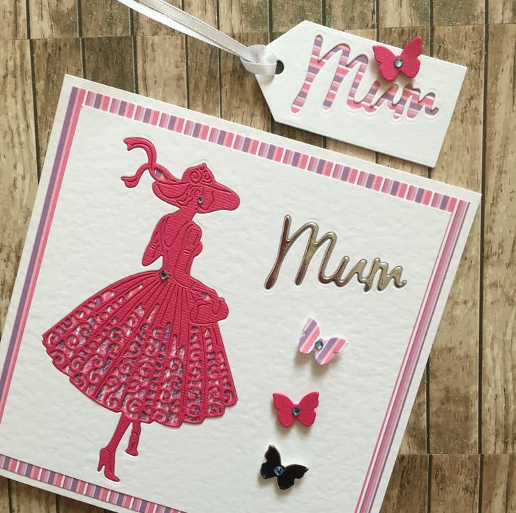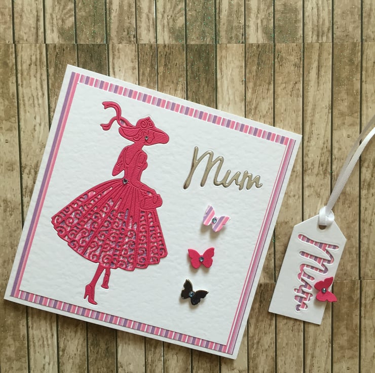 This handmade card is made by layering quality card stock and then die cutting the silhouette of a young woman wearing a deep pink 1950’s style dress with net fabric underneath. The small butterflies are die cut from coloured card. The card has a white insert which is left blank for your own personal message making it suitable for many occasions. A delicate gift tag with mum die cut from the front and a satin ribbon tie comes with this card.