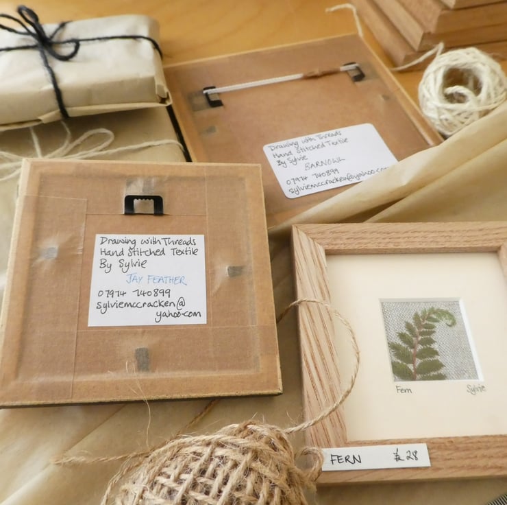 The stitched piece is nearly 5 x 5cms and the whole item is about 13.5 x 13.5cms and is ready to hang. It has been framed behind glass in a grey mount with a black wooden frame.