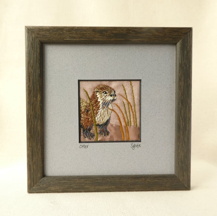 This picture was stitched by hand onto scraps of fabric using a combination of stitches of various lengths and colours. I used a silky material to represent the slippery mud of the bank and some silver thread for the whiskers. The otter's coat looks thick and chunky, and the expression is calm and serene although the claws look quite fierce!