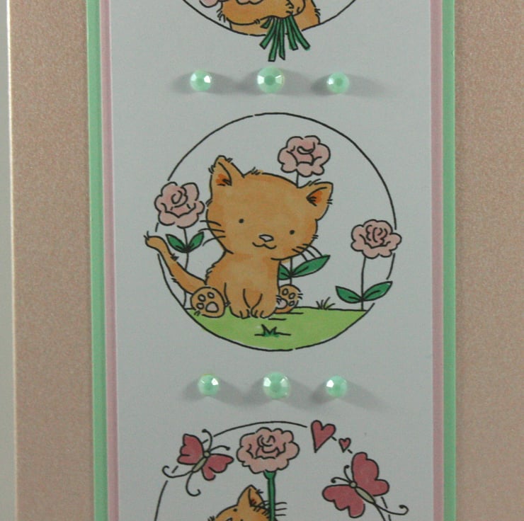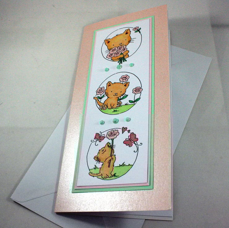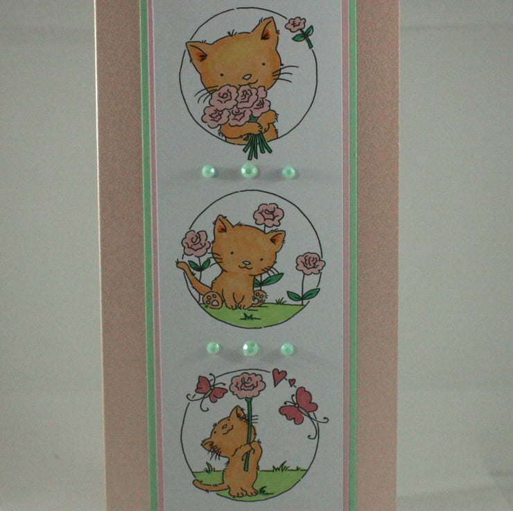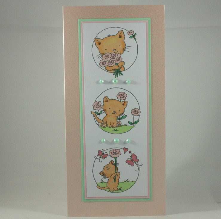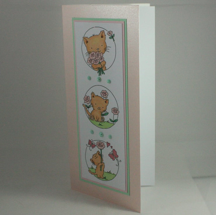 Tall, any occasion card featuring a trio of cute kittens with pink roses, hand coloured and layered onto pink and pale green card. This has been overlaid onto a pearlescent pink base card and embellished with small green gems.
