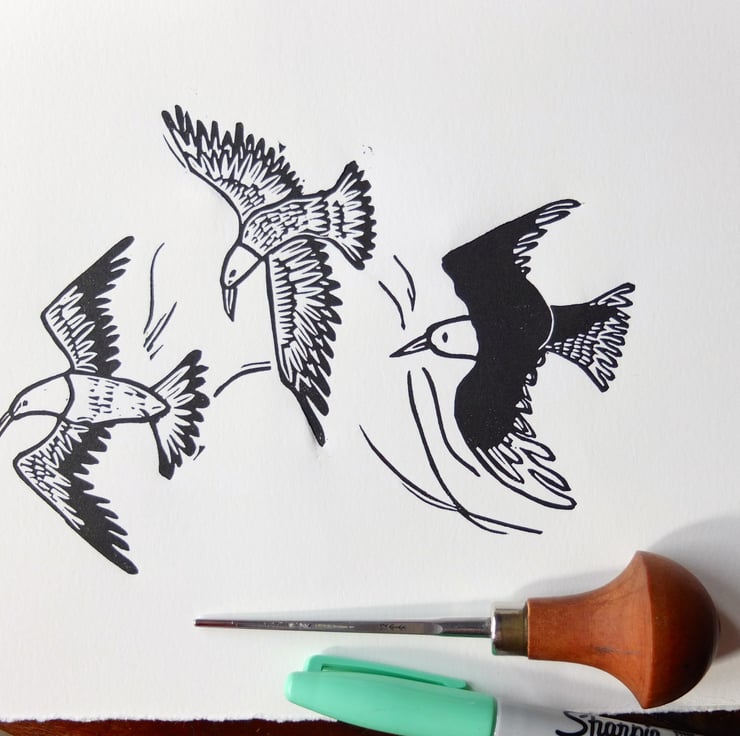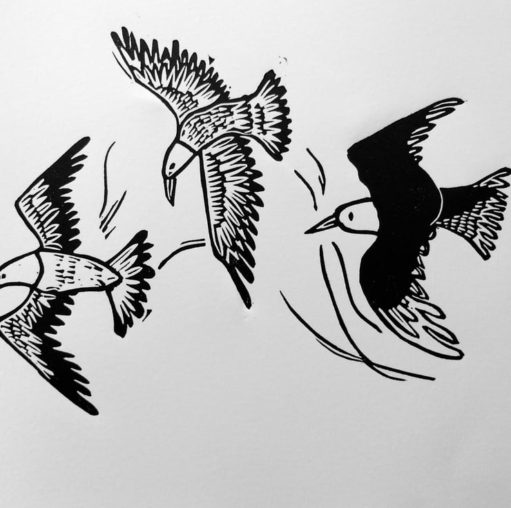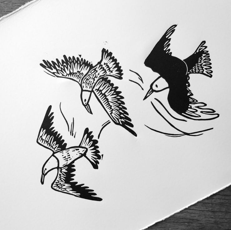This lino cut print is of Three Seagulls swirling high up in the sky - they are amazing fliers and often look like they are really enjoying flying, which is what inspired me to make this lino print.