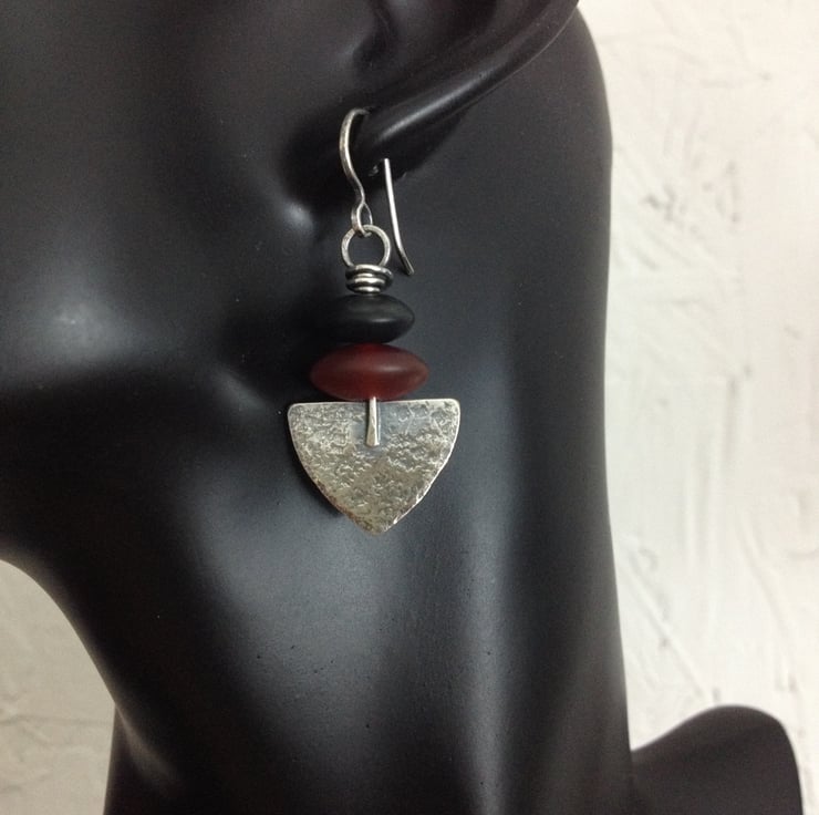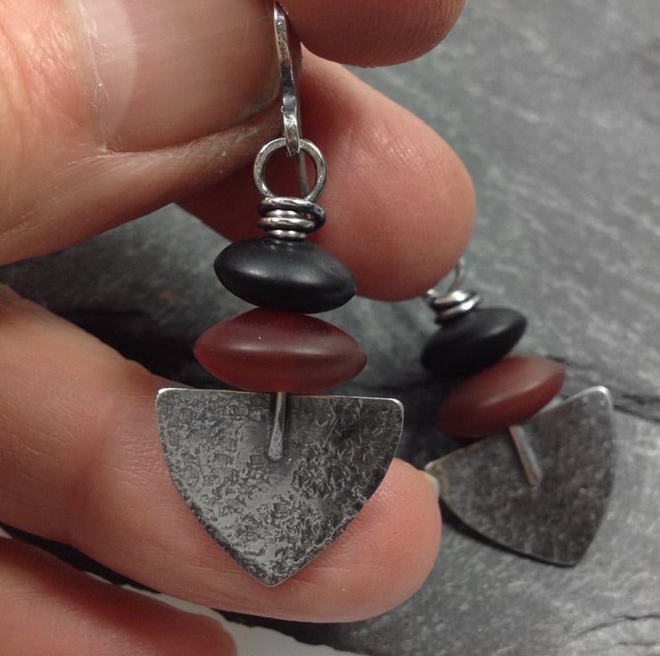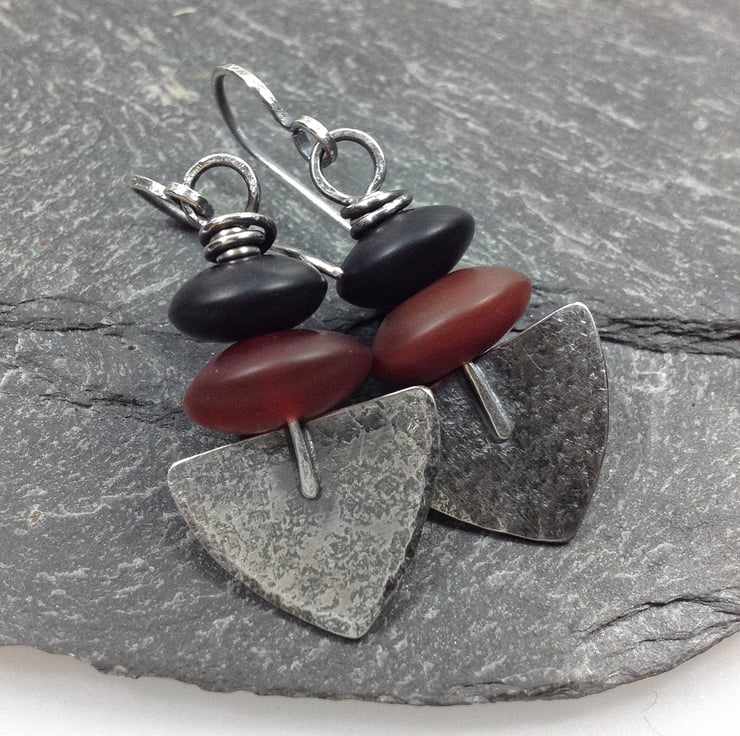 Oxidised sterling silver Shovel earrings with dark orange and black agate beads.