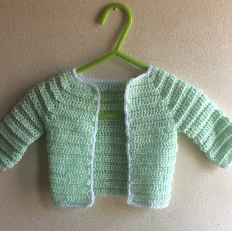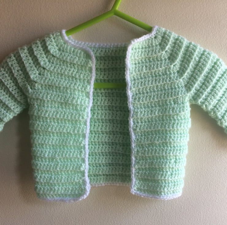 Lovely pastel green coloured baby cardigan with ridge pattern.