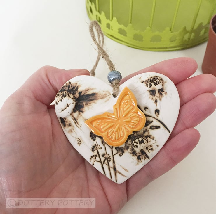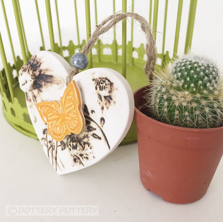 This cute little hanging heart decoration has been made from white earthenware clay where it has been decorated with a flower design and then fired twice.
