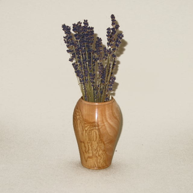 This small vase was primarily designed as a purely decorative piece. It has a dulled melamine lacquer and wax finish. Sorry but lavender to included.