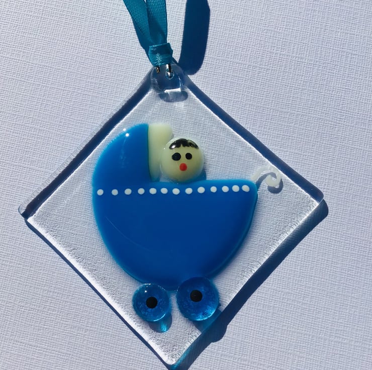 Fused glass baby in pram which will have the name of your choice written on the pram ...see example photo . Size is 4 in square which can easily hang on nursery wall or furniture . Made to order and personalised with the babies name written on the pram . Available in blue or white with pink spots for a girl.