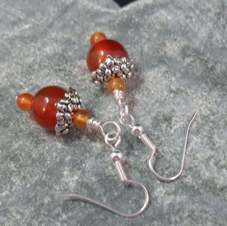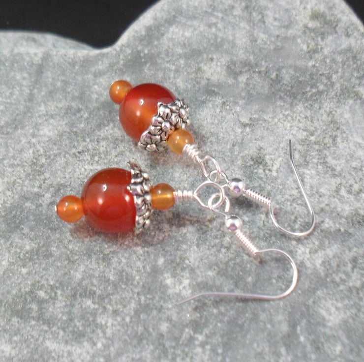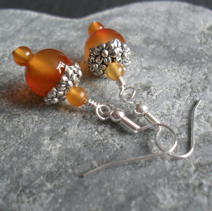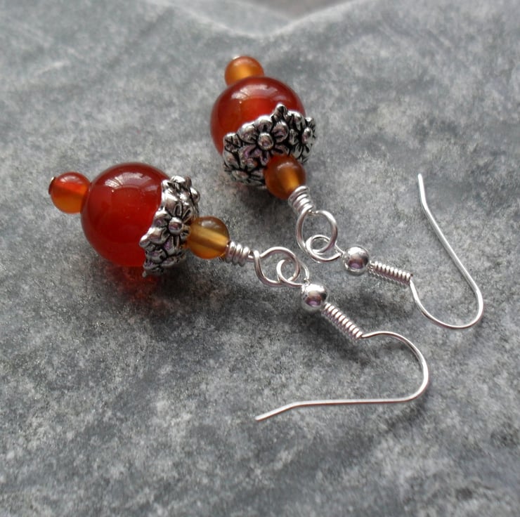 Carnelian semi precious gemstones with silver tone bead caps with a flower pattern are attached to silver plated ear wires