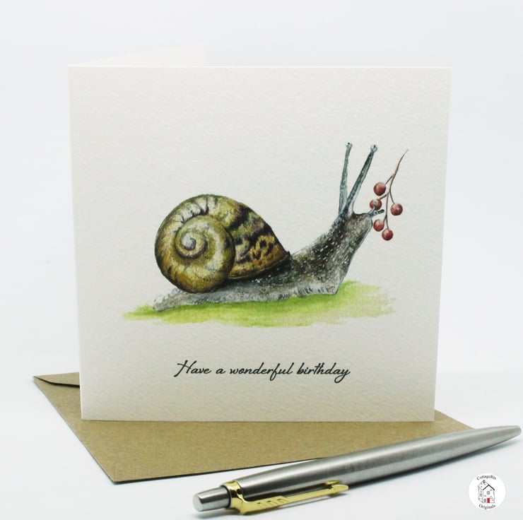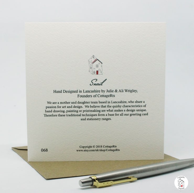 This snail design was taken from our original hand drawn and painted illustration which has then been digitally printed on 350gsm watercolour paper.