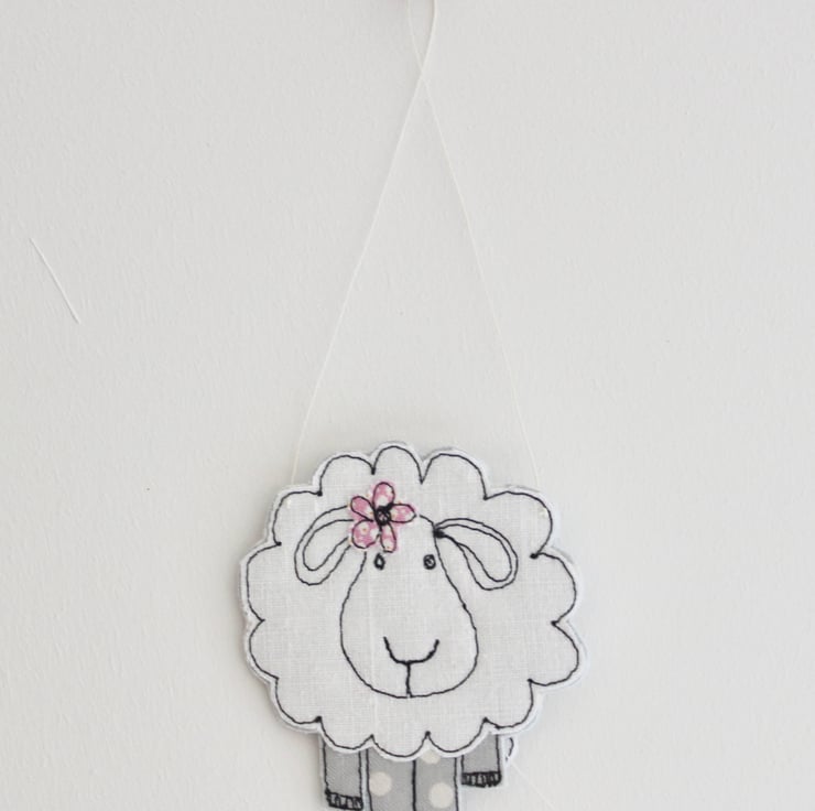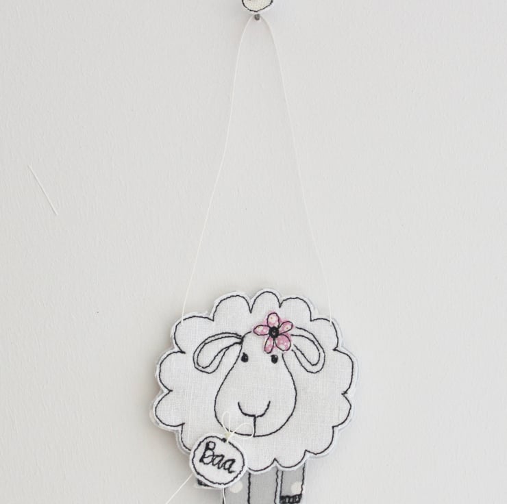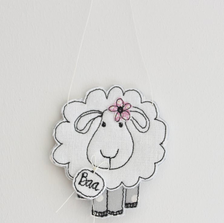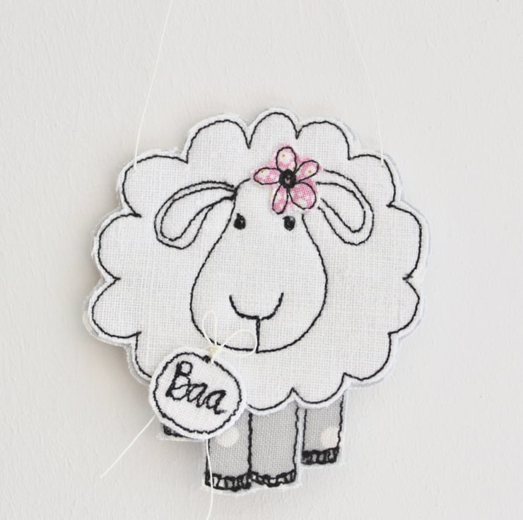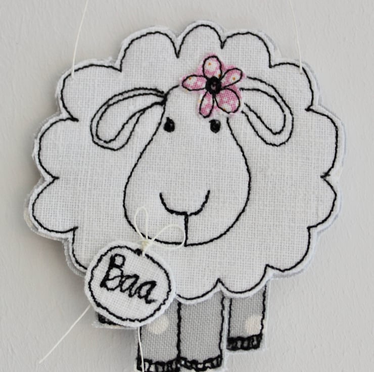 Sheep is sewn using cotton cloth and free hand machine embroidery; with a flower detail, a sewn fabric label 'baa' and a linen string to hang.