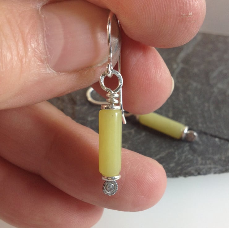 Forged sterling silver pins have been threaded through 5mm silver washer beads and pale creamy yellow jade tubes.