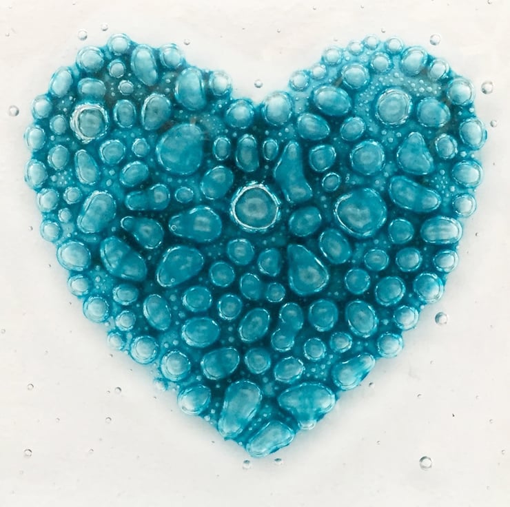 To make these heart hangings I start with cutting 2 squares of transparent art glass. I handpaint my heart design using specialist glass paint. I then make a little wire ring to hang the square. The painted heart is then capped with the second square of glass and fired overnight in my kiln. The heat of the kiln turns the paint into tiny turquoise bubbles. When completely cooled and washed, I add the hanging wire.