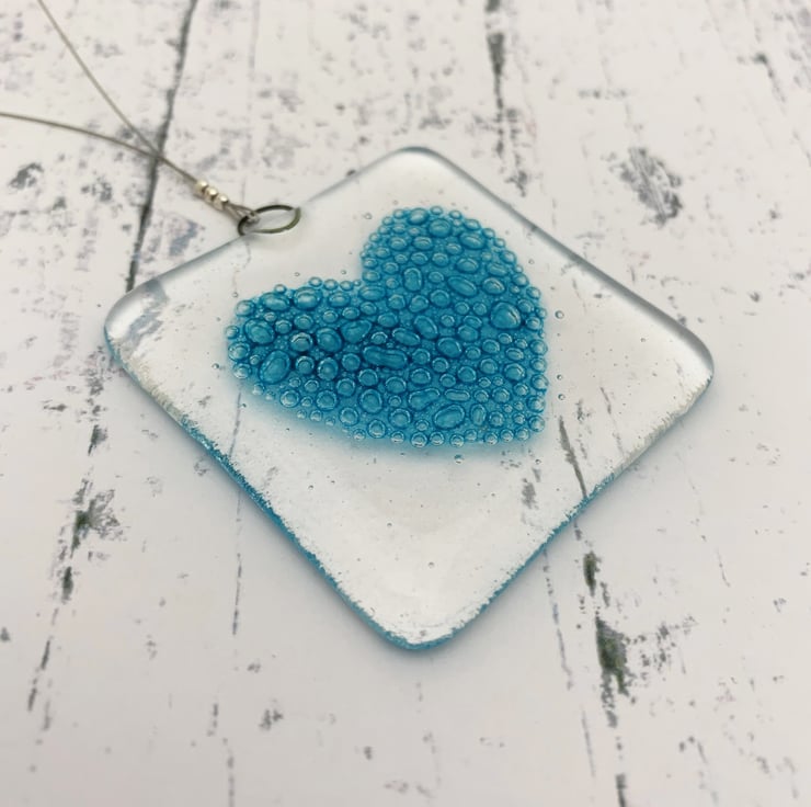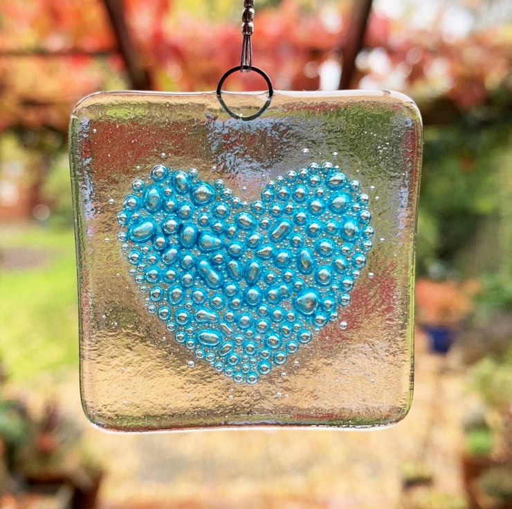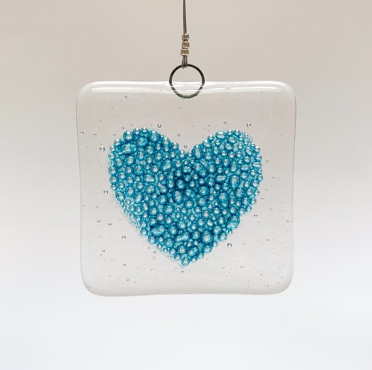 Fused glass hanging with handpainted turquoise bubbly heart. These fused glass squares make wonderful small gifts and look lovely when hung in a window.