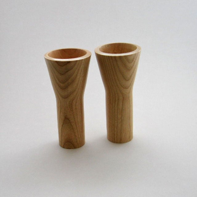 This pair of vases were really intended for decorative use but the may be used for dry flowers. Made in ash the shape was turned to enhance the beautiful figured grain. They are finished with a dulled lacquer and waxed to give a warm sheen.