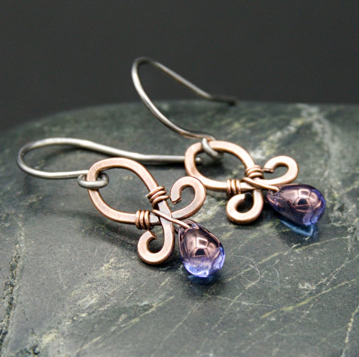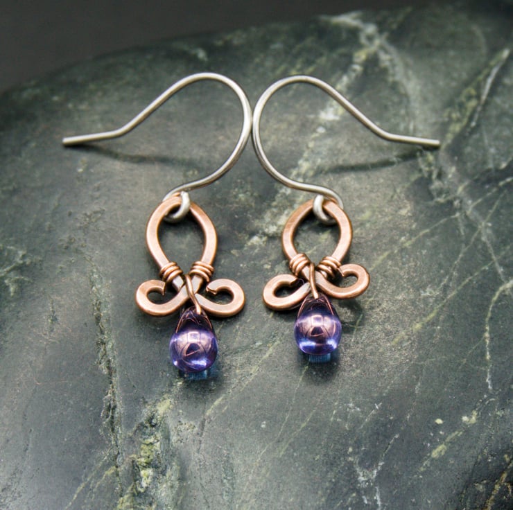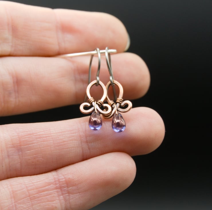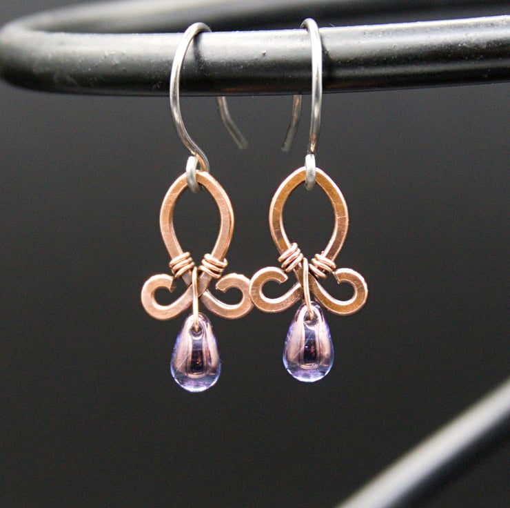 These gorgeous little earrings are made from copper wire, which has been shaped then hammered flat. I've then added little glass drop beads with very fine wire - the beads are called 'purple lustre' but they are a pale blue when held to the light & are really very pretty.