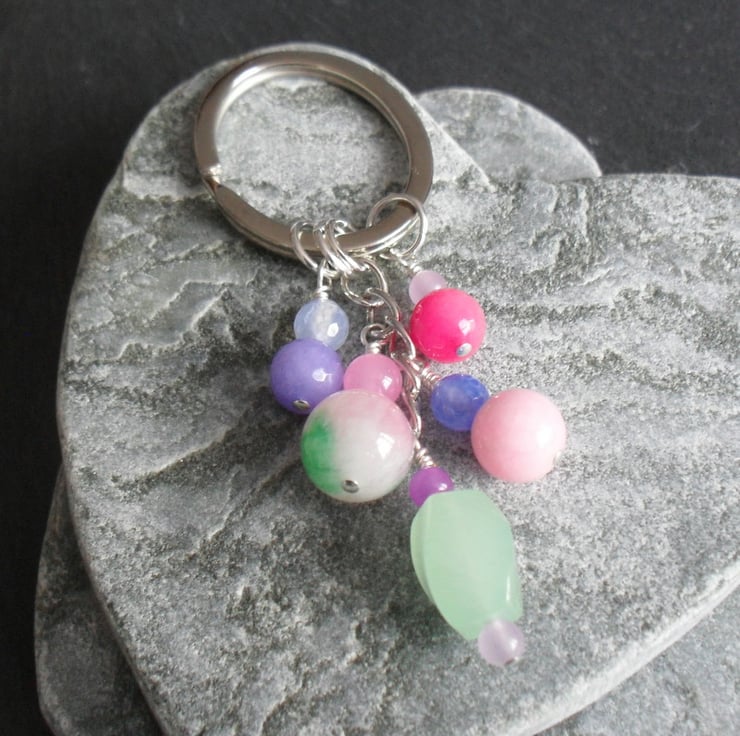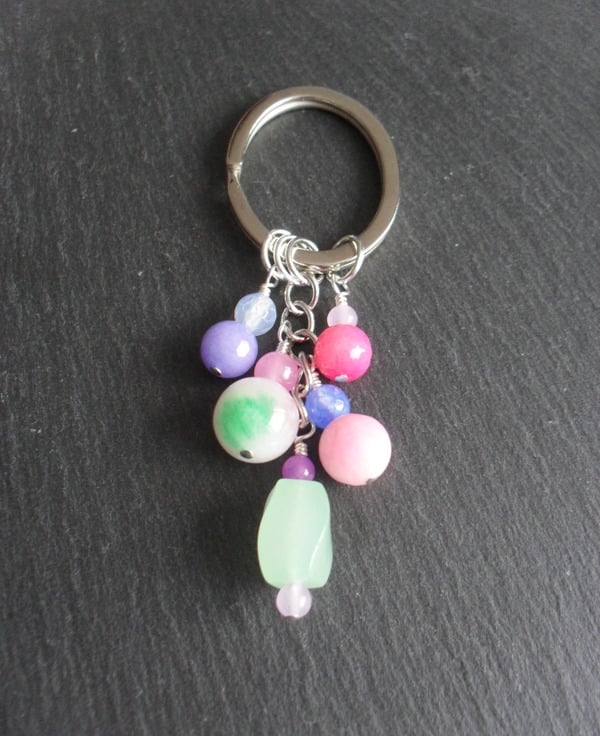 Quartzite and quartz semi precious gemstones are attached to a oval shaped silver tone keyring