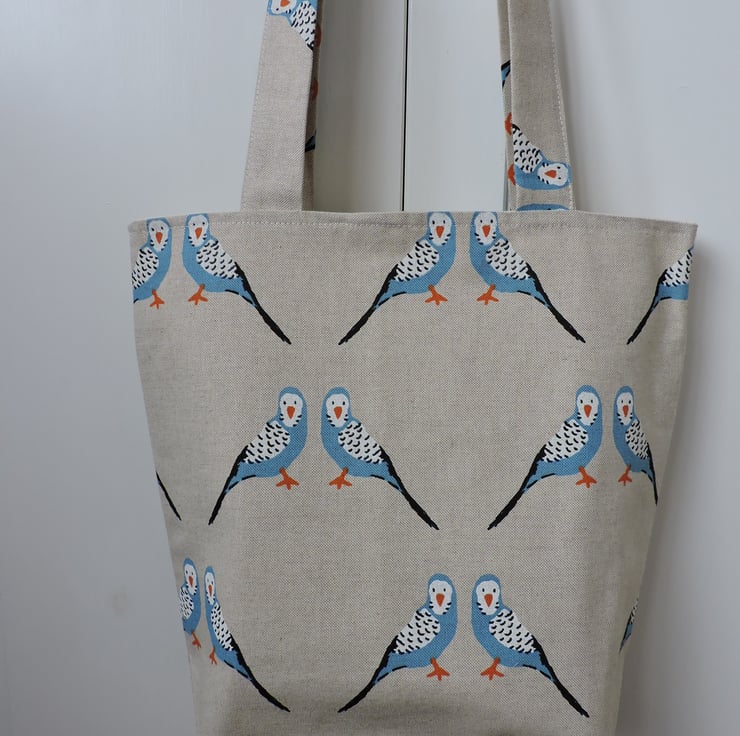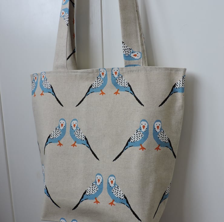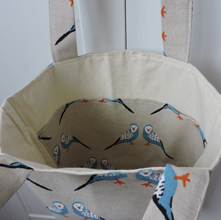 I've made this tote bag, shopping bag, craft bag with a cotton duck fabric depicting turquoise budgies on a cream background . Fully lined in cream cotton fabric, and has a squared off bottom and a full width divided pocket.