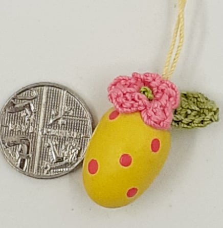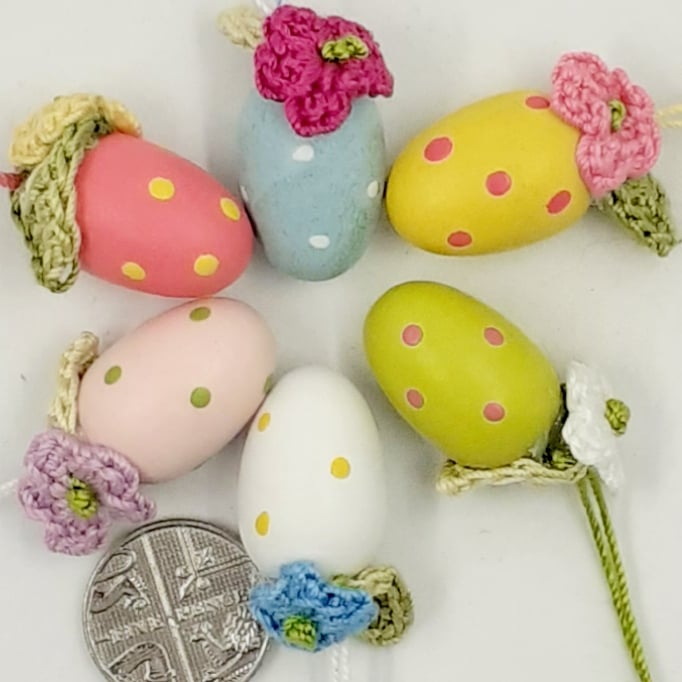 These dainty Easter decorations have been made by adding a hanging loop and a tiny handmade (by me!) crochet flower and leaf embellishment to small painted wooden eggs. The flowers and loop are made from fine yet strong crochet cotton. The eggs measure approximately 2 cm in height. They are perfect for hanging on an Easter branch.