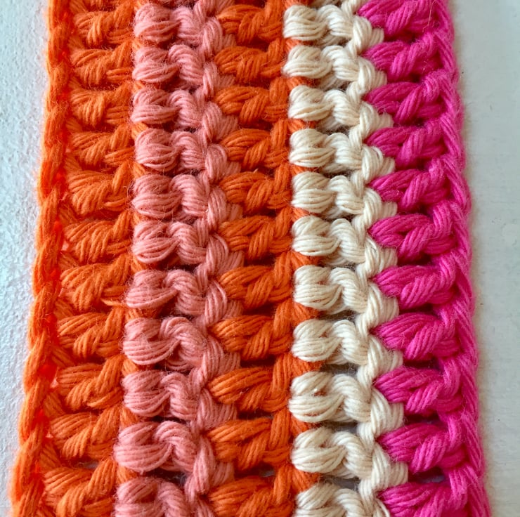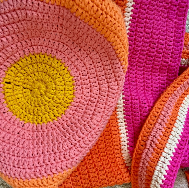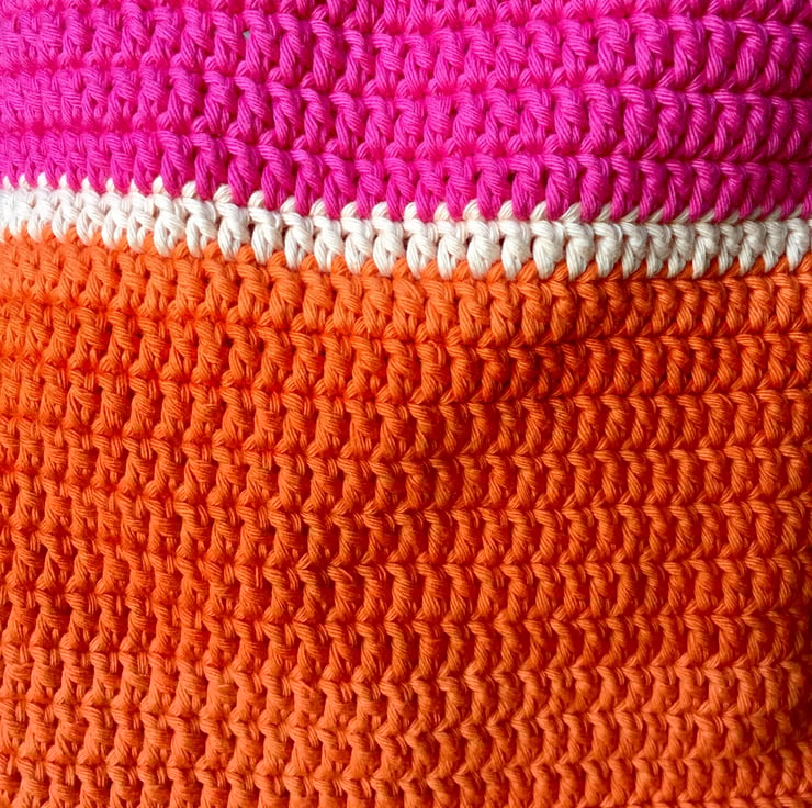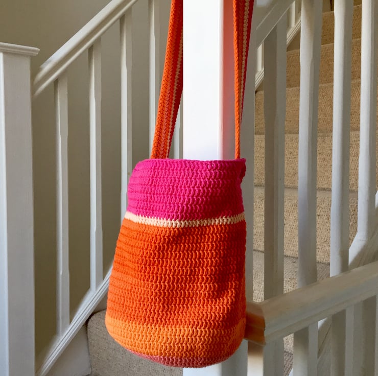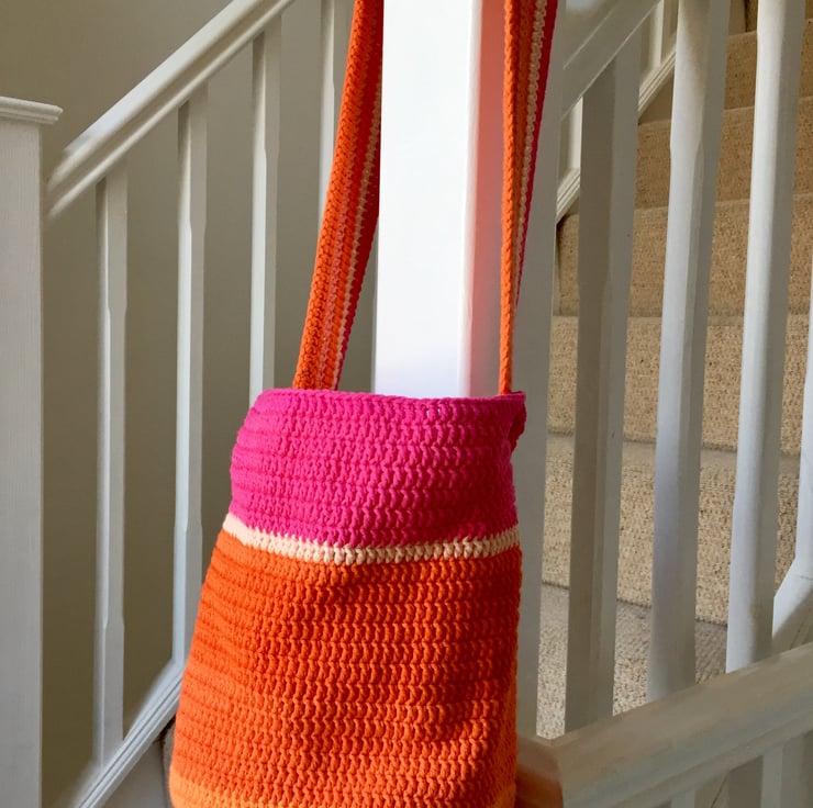 Crocheted in 100% cotton yarn in bright and colourful colour blocks. I've used shades of orange, yelllow and pink. The strap is crocheted in stripes of orange and pink.