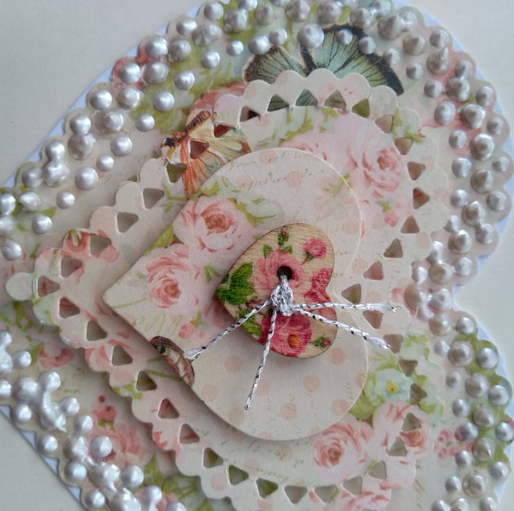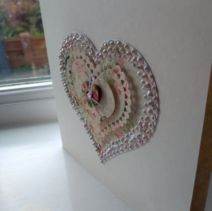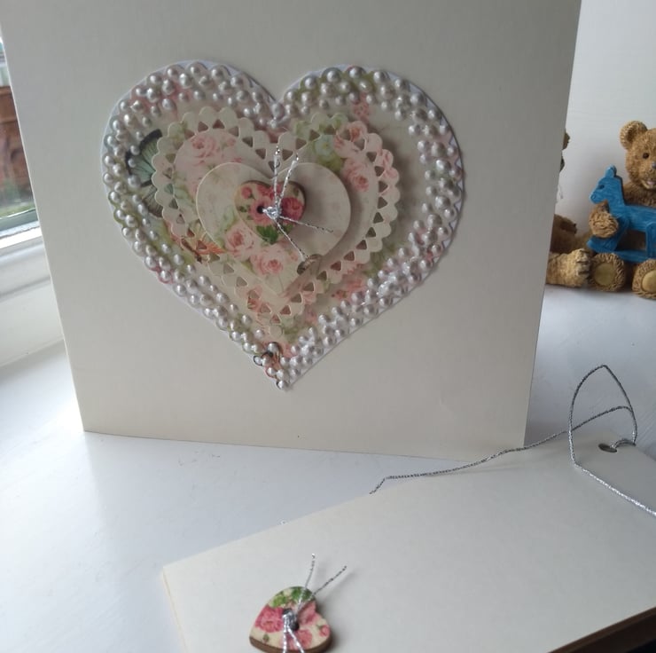 A completely handmade and uniquely designed card. Consisting of three hearts die cut from gorgeous vintage floral paper mounted onto quality cream card. A floral wooden heart with silver cord tops it off. Embellished with pearl drops