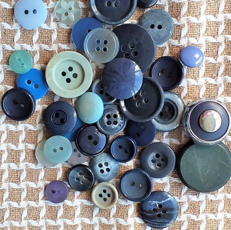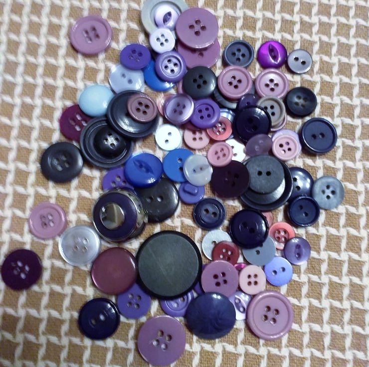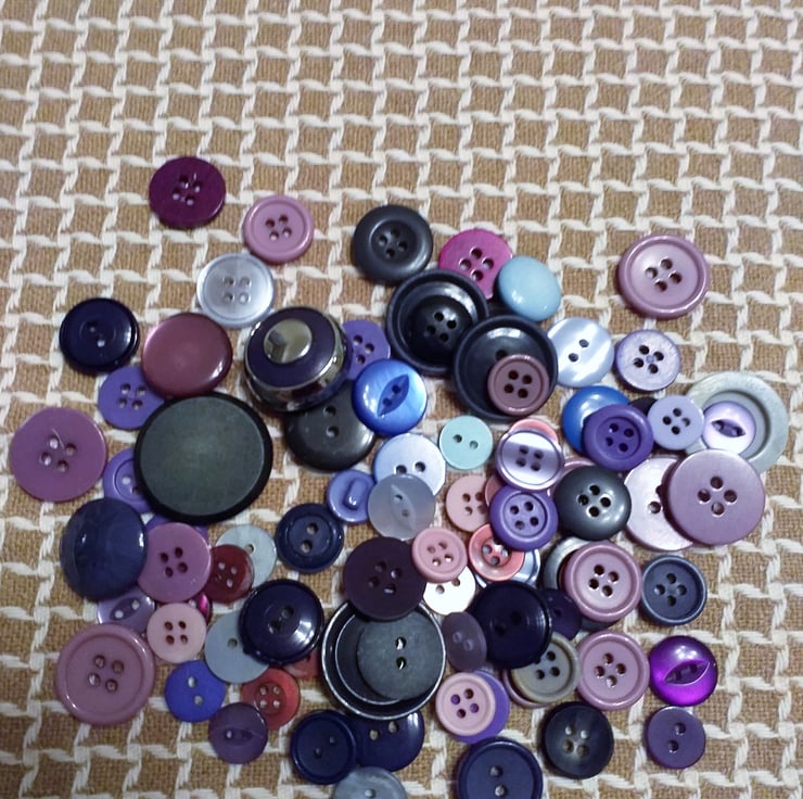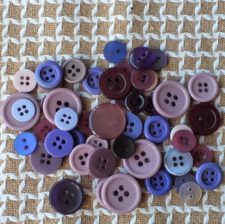 An assortment of blue and purple recycled buttons of various sizes, two hole, four hole and shank. Weighs approximately 45 gram.. Would be useful for jewellery making or card decoration.