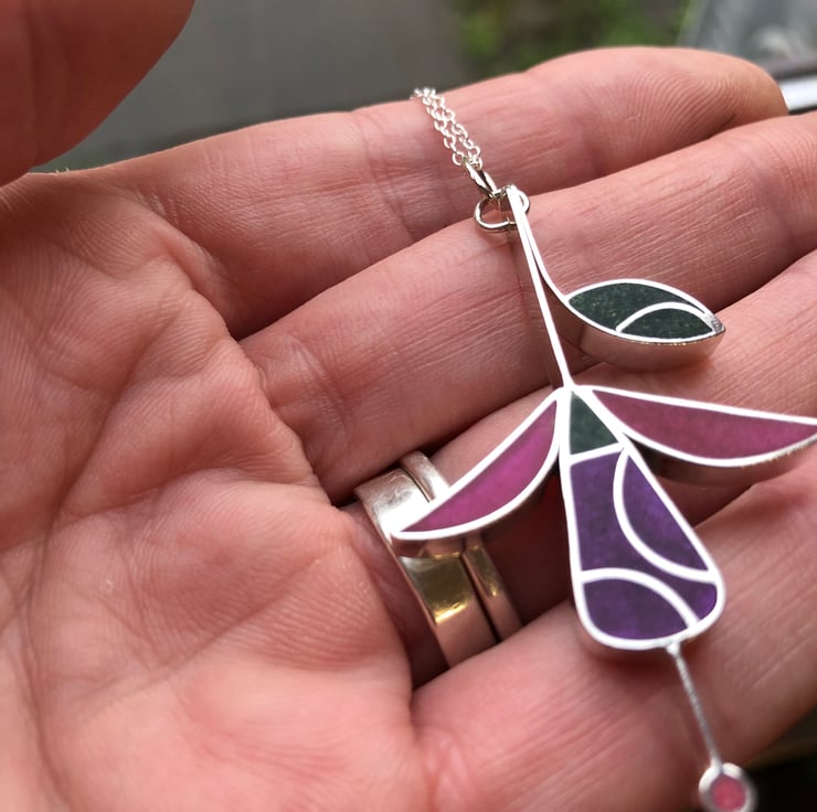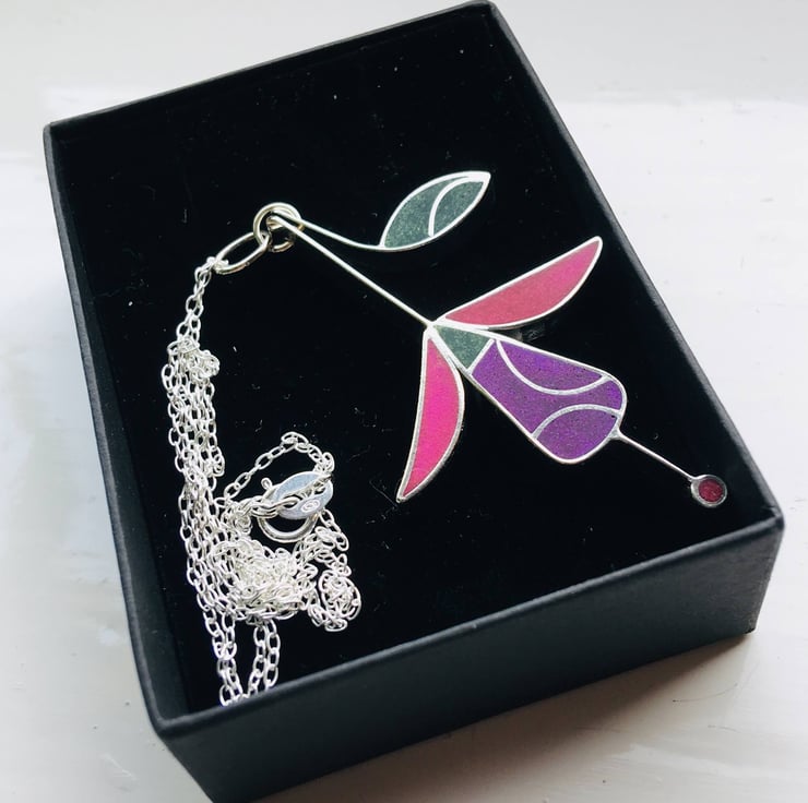 This fuchsia pendant has been handmade by me using sterling silver and coloured resin.