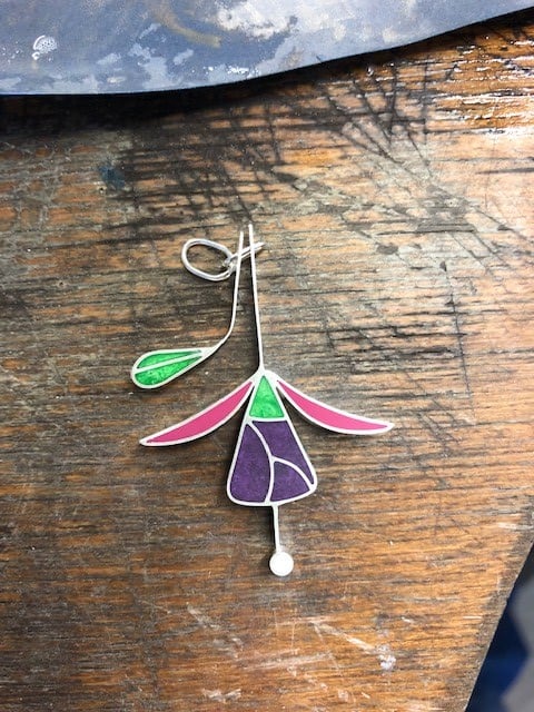 It is made using hand cut strips of metal that are then formed and soldered individually onto a base, then each section is painstakingly filled with hand mixed coloured resin that is polished to a shiny finish.