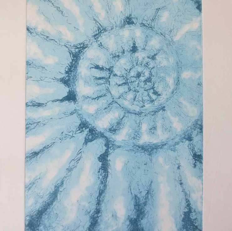 Original handmade etching print of an ammonite spiral fossil printed in blue ink on white paper. This is no.3 print in a variable edition of 95 (no two prints in the edition will be the same). Image size 20.5x15( approx 8x6 inch) and comes unmounted on paper measuring 21x30cm (A4 paper - 8.25x11.75inch approx).