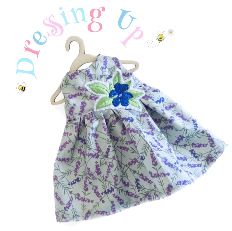 A beautiful dress made from best quality cotton in a lavender sprig print to fit the Mulberry Green characters. The dress has a full skirt and a lined bodice and is decorated at the waist with an embroidered violet. It comes on a cute little wooden hanger.