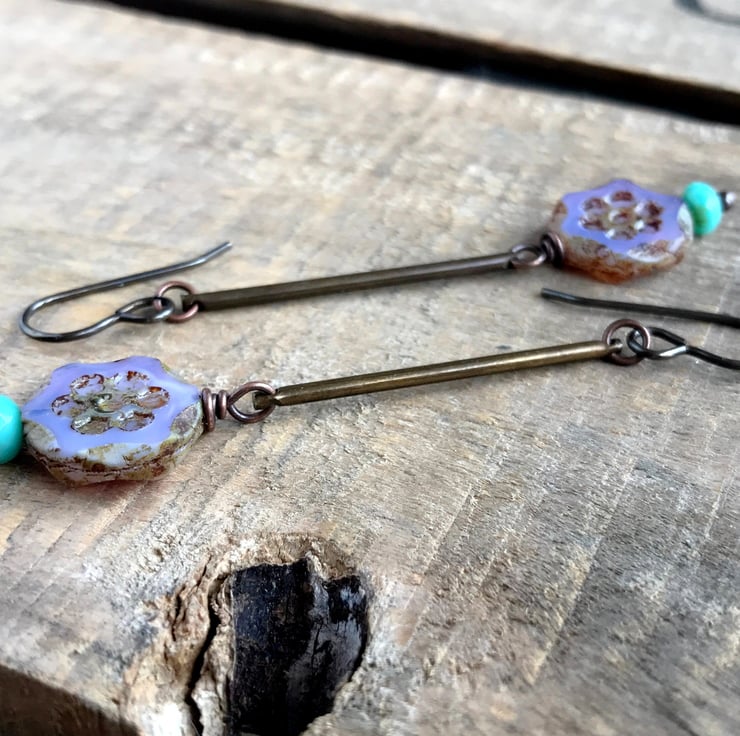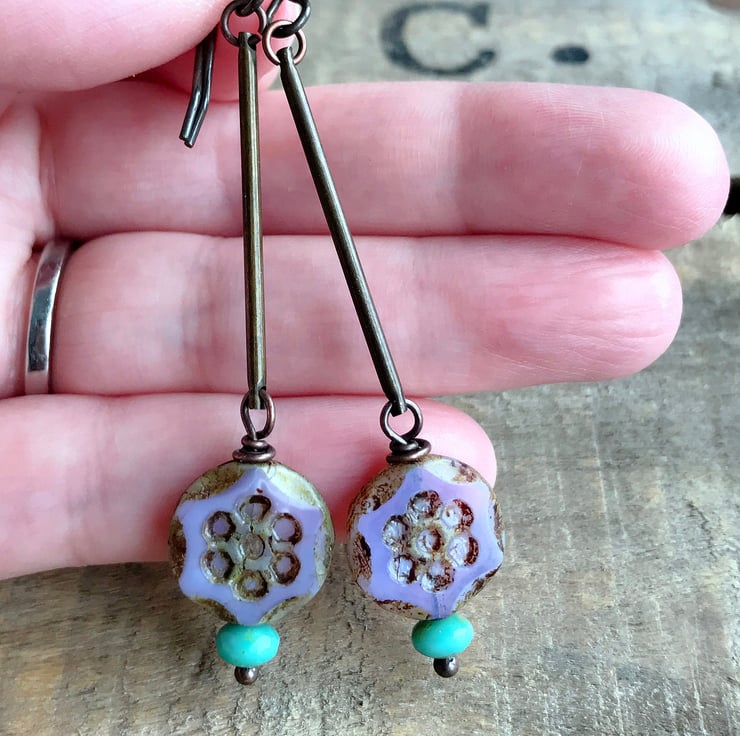 They feature daisy flower coins in a delicate shade of purple with rustic serrated edges and Picasso finish. The coins sit on copper ball headpins with contrasting tiny aqua faceted glass rondelles below.