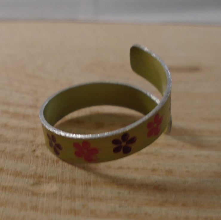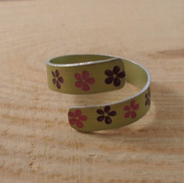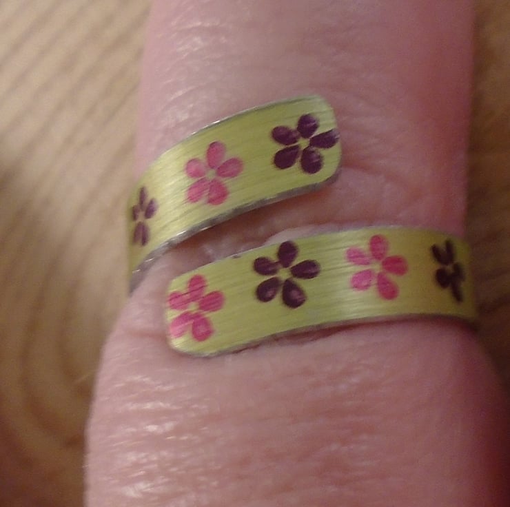 A simple, and summery ring, hand made from anodised aluminium. A thin strip of aluminium has been hand cut and dyed a summery yellow. It has then been hand stamped with little flowers in pink and purple. It has then been bent around a mandrel to form a cross over, adjustable ring.