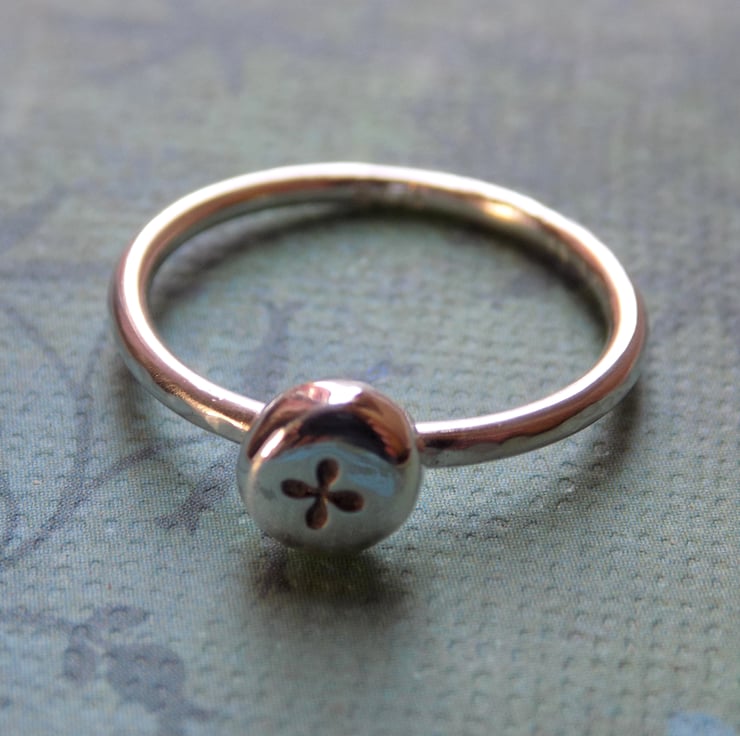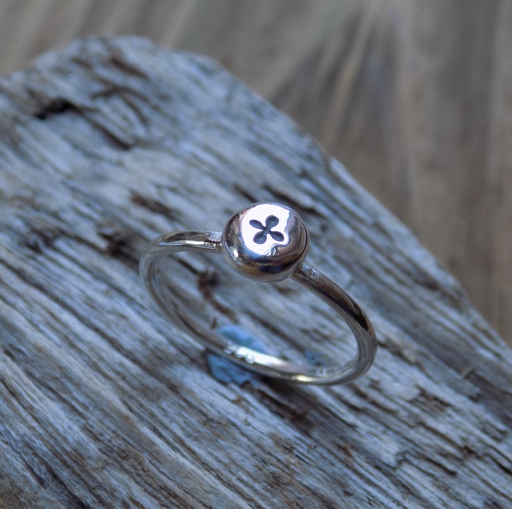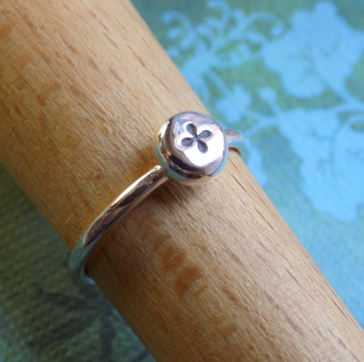 A ring made from off cuts of sterling silver which have been melted down, shaped, sanded and polished to a high shine. Stamped with a pretty 4 pointed shape, and soldered onto a 1.5 mm hammered ring shank.