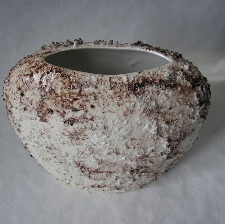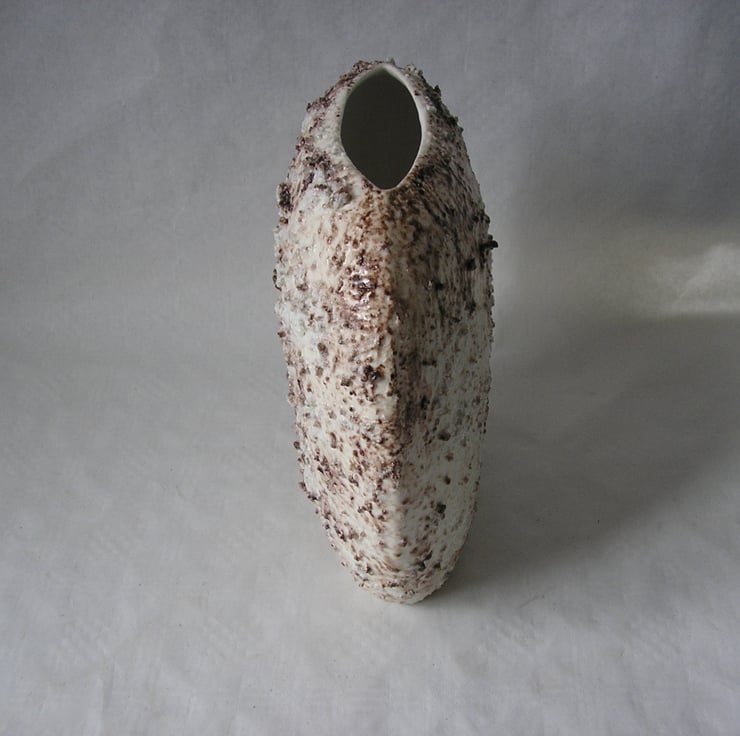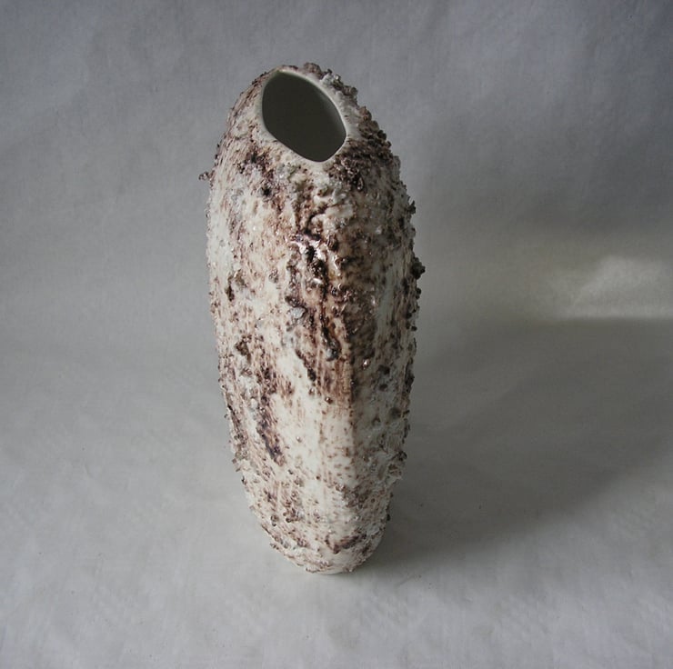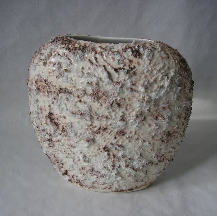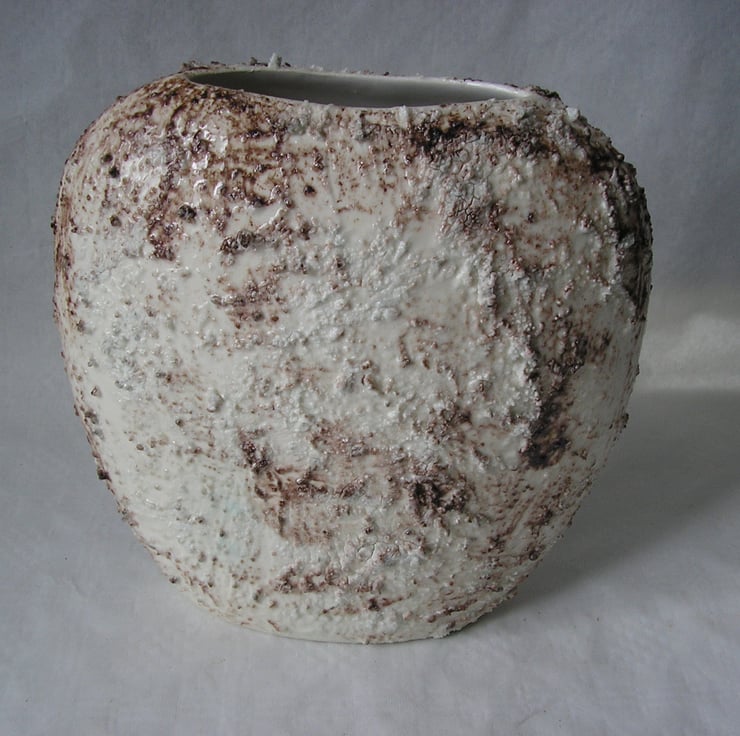 I LOVE MAKING MY OWN GLAZES, AND THROUGH VARIOUS TESTS OF GLAZE MATERIALS I DEVELOPED THIS "CRUMBLE" GLAZE. THE SURFACE OF THE VASE IS QUITE RAW AND ROUGH AND I ADDED OXIDES TO ENHANCE THE WHITE BASE GLAZE.