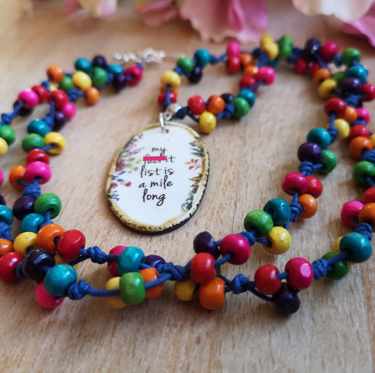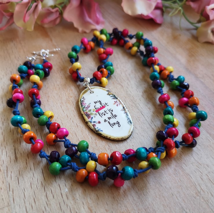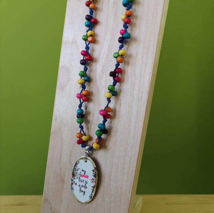 This cheeky necklace has been made with rainbow coloured wooden beads knotted onto dark blue cotton cord. A ceramic pendant is the focal point, stating "my fuck it list is a mile long." A star shaped toggle clasp has been used as a fastener.