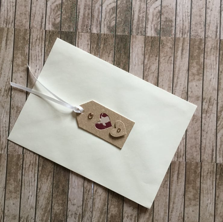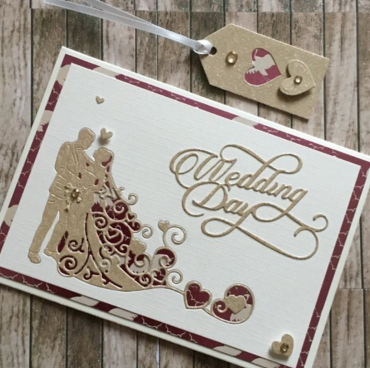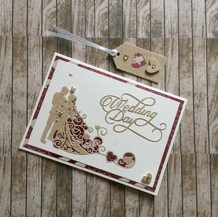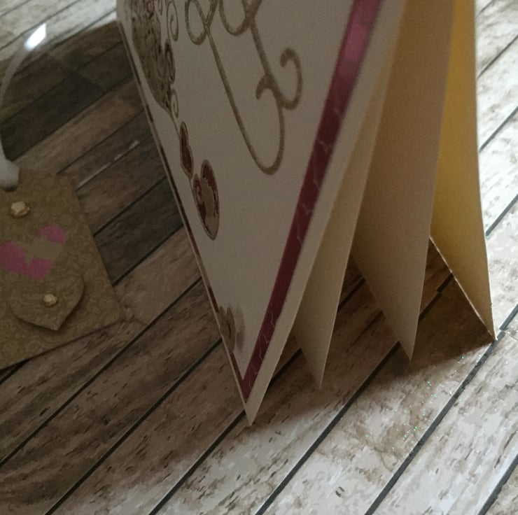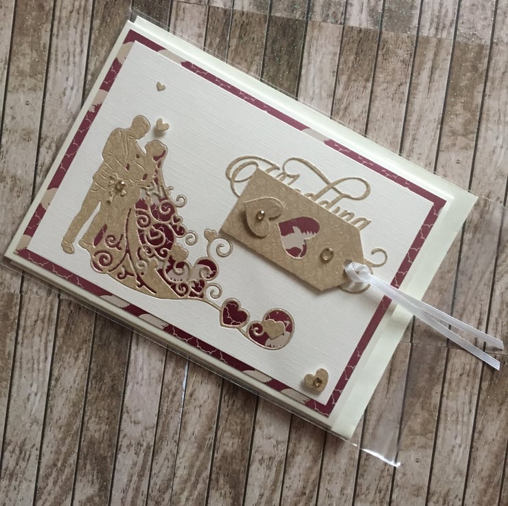 This beautifully handmade card is layered using premium 300gsm champagne coloured, linen style cardstock, deep pink and cream coloured cardstock and a good quality cream coloured card to add interest and create an attractive border. The card depicts a handsome couple, die cut from gold sparkly textured card and set into the card front. The insert is left blank for your personal message. An attractive coordinating gift tag with satin ribbon will accompany this lovely card.