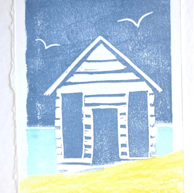 'Oh I do like to be beside the seaside.....' Block printed and hand coloured a beach hut greeting card for beach lovers, shell collectors and dreamers....