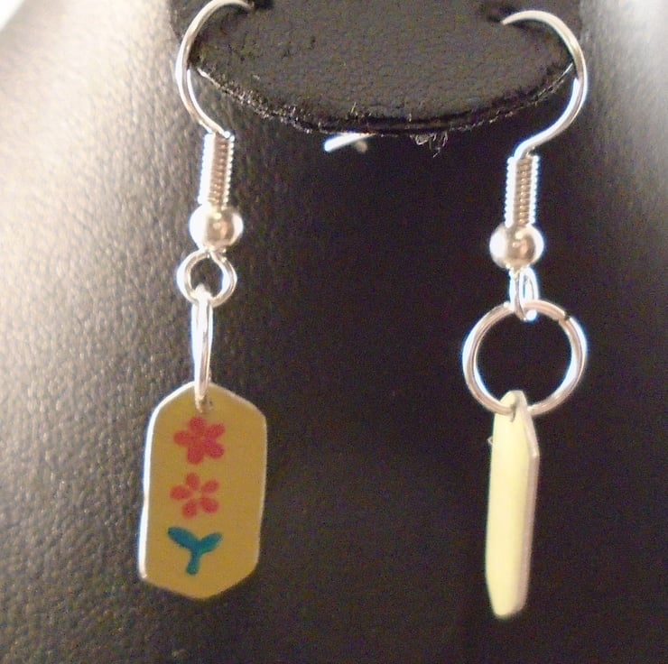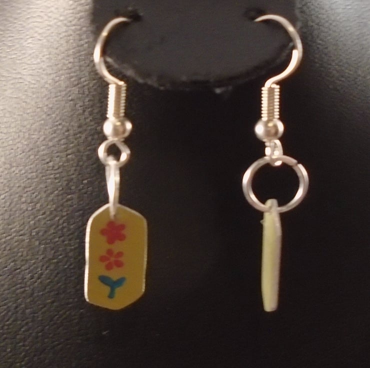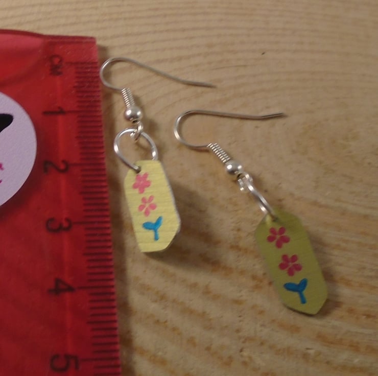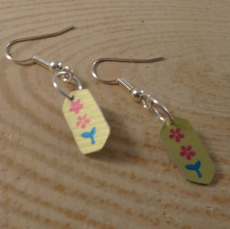 A simple, and subtle pair of earrings, hand made from anodised aluminium. Two pieces of aluminium have been hand cut and dyed yellow. They have then been stamped with flowers and leaves. A hole has then been drilled in the top, so they can be attached to silver plated ear wires.