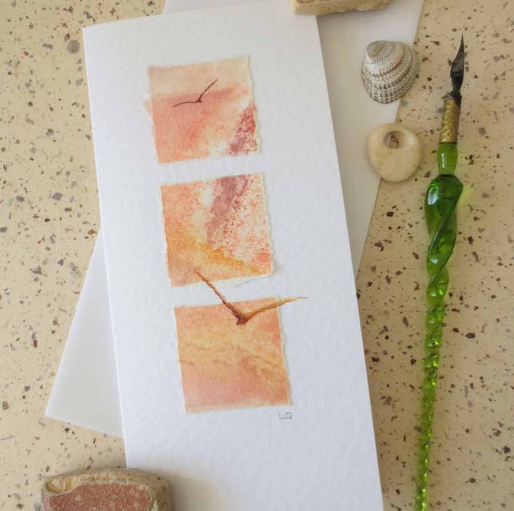 Hand drawn and painted stylised mixed media art card depicting a gull at sunset. This is a one of a kind, never to be repeated design and would be suitable for framing.