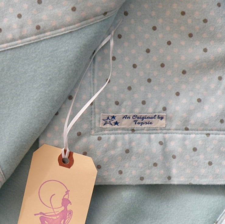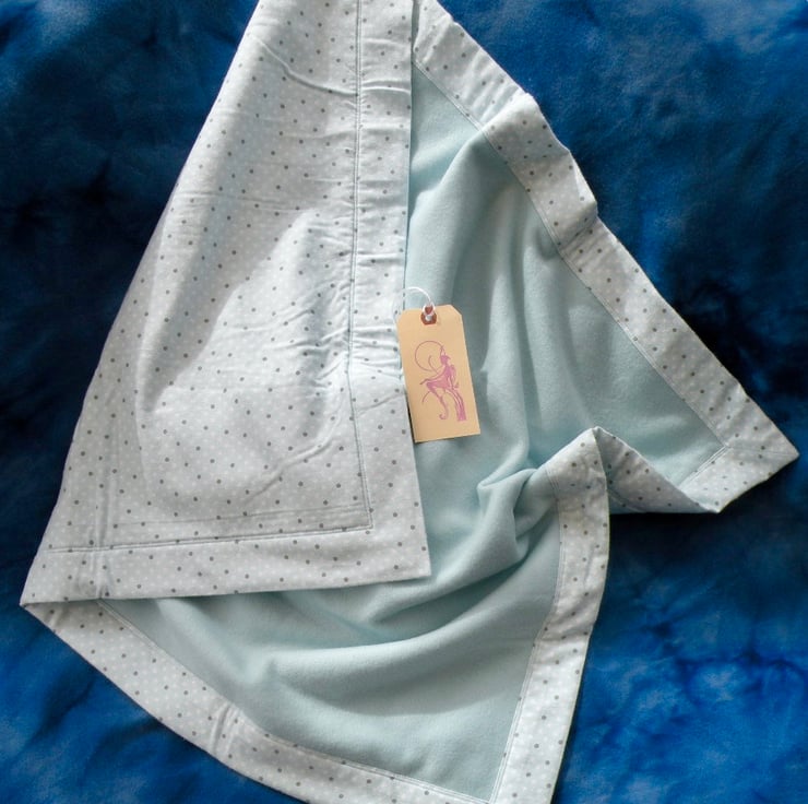 You will keep your baby or toddler really warm with this blanket made from Fleece material (with brushed cotton backing) in a grey and white spot pattern. It was hand-made by me and is ideal for little girl.