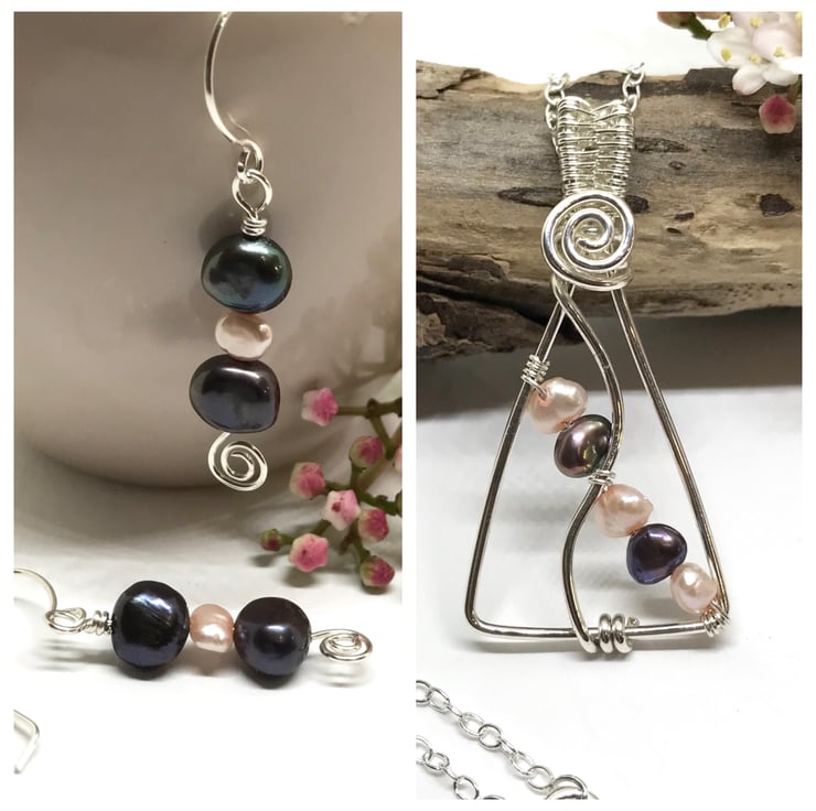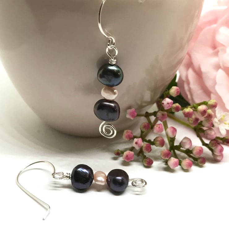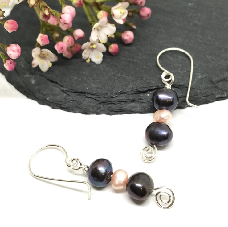 I have chosen dark brown pearls with pretty pale pink and threaded them onto sterlng silver wire, finished with a wrapped loop at the top and swirl of silver at the bottom. These are attached to handcrafted sterling silver ear hooks.