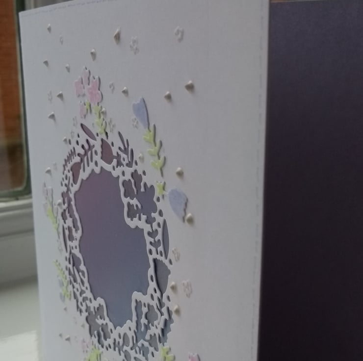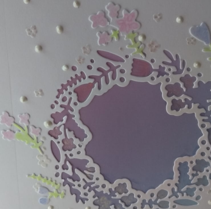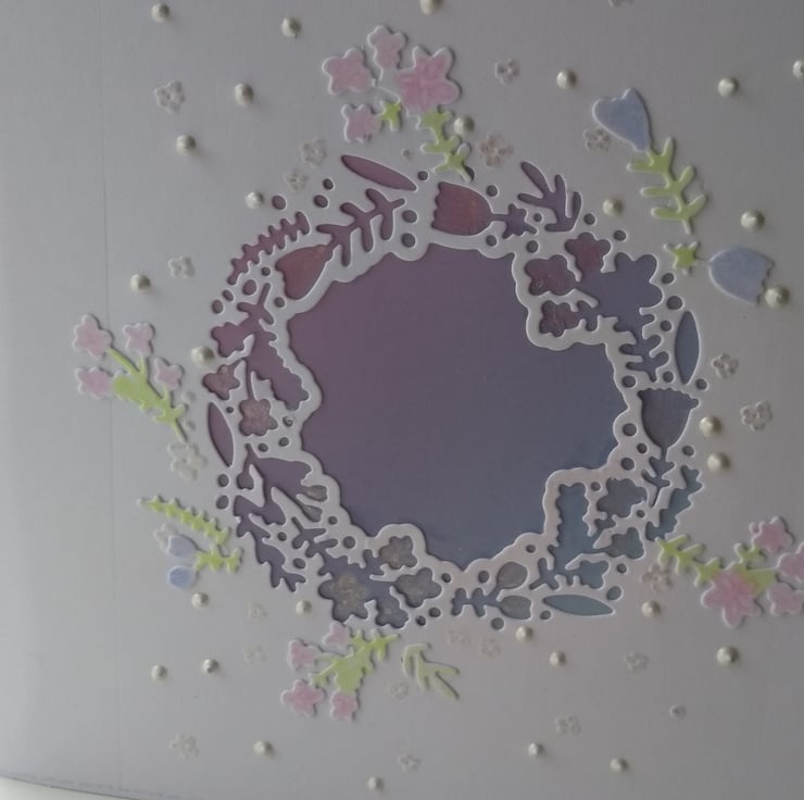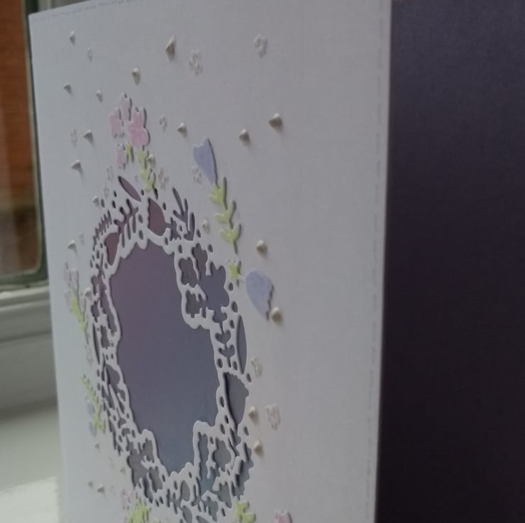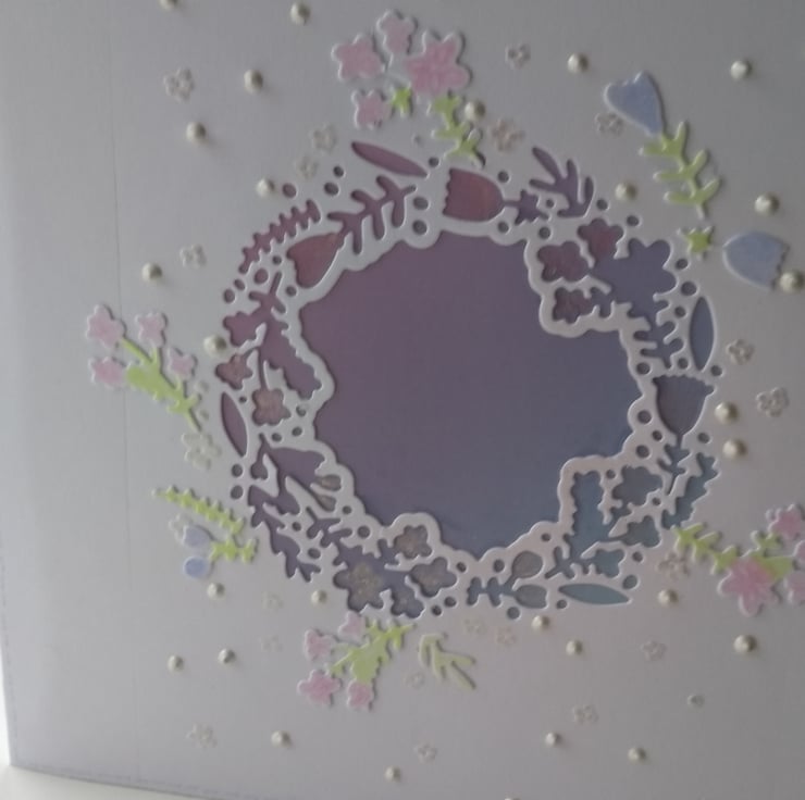A completely handmade and uniquely designed card. Consisting of quality pristine white card which has been die cut with a pretty floral wreath. Flowers and leaves embellish the edges and these have been hand colored in pink, lilac and green. Mounted onto lilac/ blue shaded paper. Finished off with silver highlights and pearl drops