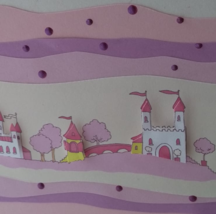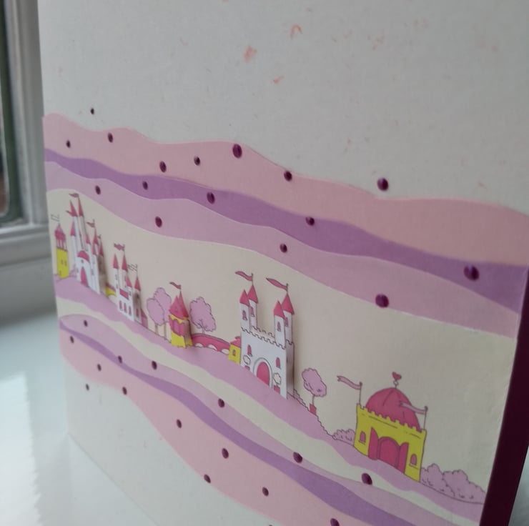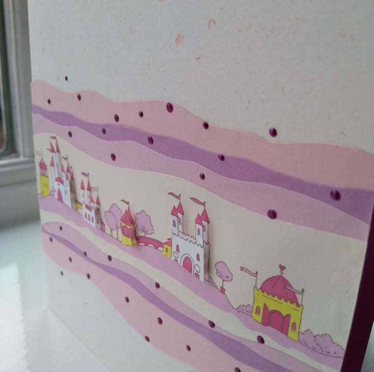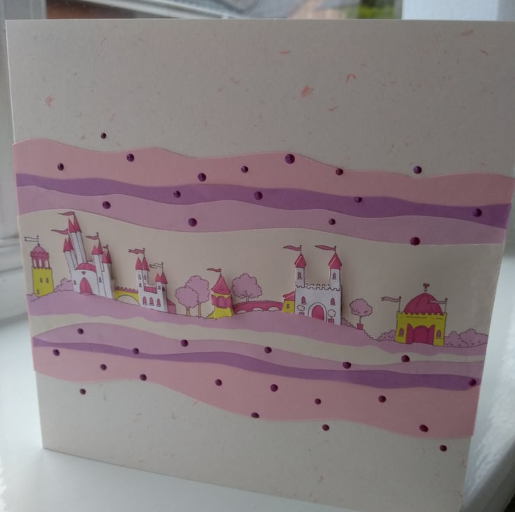 A completely handmade and uniquely designed card. Consisting of a row of fairy castles decoupaged. Mounted onto co ordinating pink card and then onto quality cream/ pink flecked card