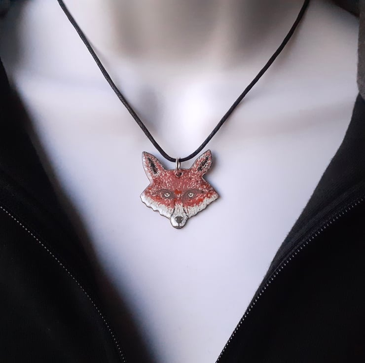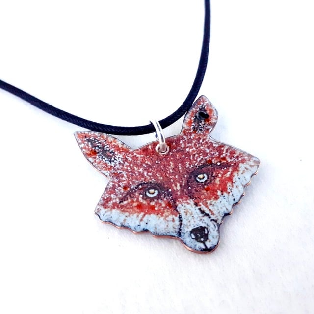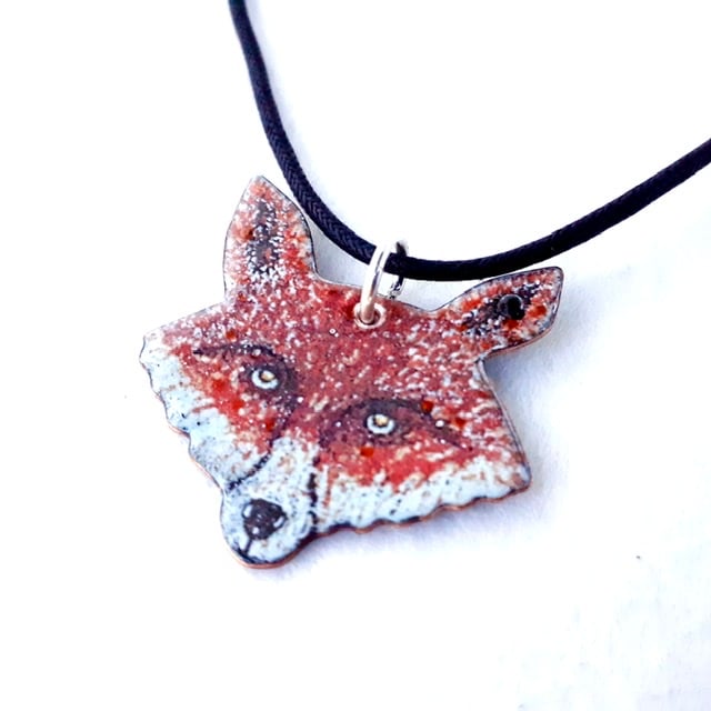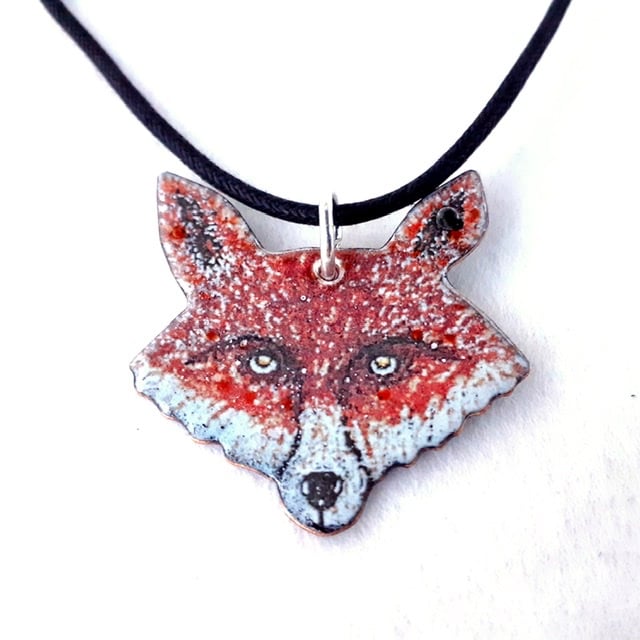 This hand-cut enamelled copper fox head pendant design is unique to my jewellery and a new addition to my wildlife range. The foxes head pendant is enamelled in foxy colours on the front and a mixed colour on the reverse which adds strength and durability. The pendant measures approximately 3.5cm by 3.5cm and hangs from a black cord which is available in several different lengths and has a silver-plated hook fastener. It will arrive packaged in a gift box inside an outer card delivery box and be sent by 'Tracked' Royal Mail postage.