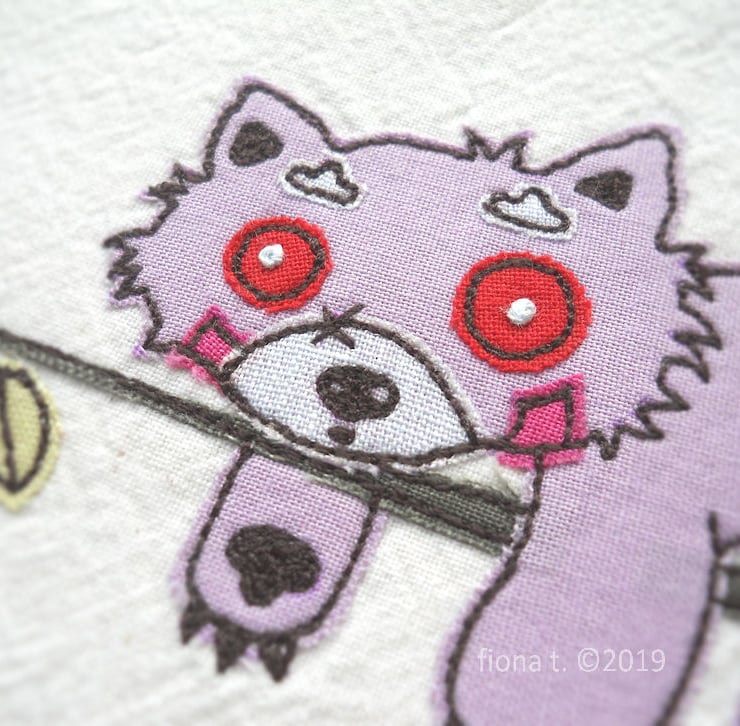 this adorable zombie red panda is snipped from lilac & purple cottons and corpse-coloured pale blue irish linen. the tree is olive with pale green leaves & stripes.