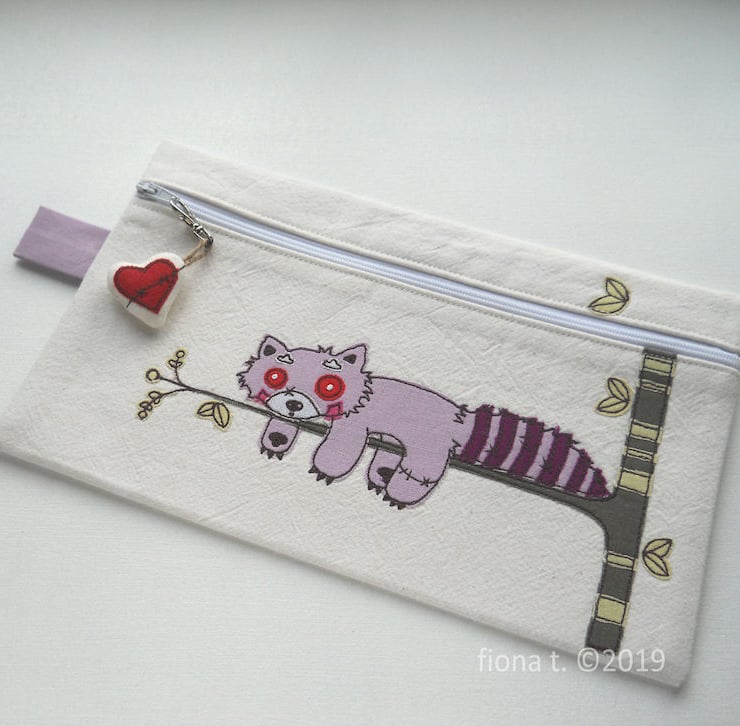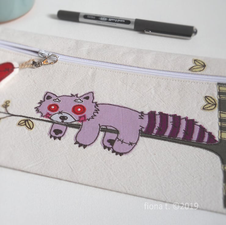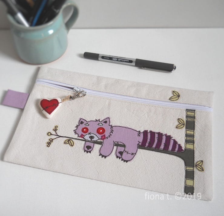 applique & freehand embroidered zombie red panda large pencil case - lilac.