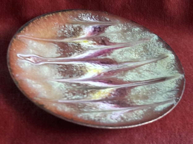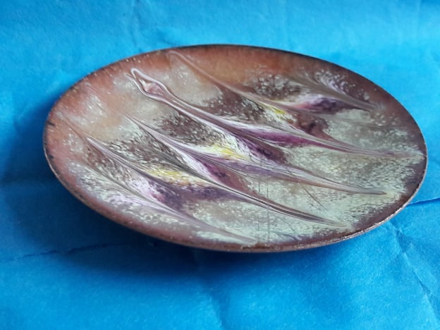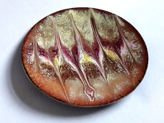 I have built up a base of clear enamel over a copper dish then added a layer of cream. After firing this I added a line of white enamel across the dish and scattered transparent gold and orchid enamel that would show their colour over the white. When the piece reached red heat in the kiln I drew through the surface with a steel tip to create the unique, random pattern. The copper colour of the dish shows through the cream enamel, golden brown, and the dish has a textural element where the surface has set smooth but uneven after being drawn through. All of this affects the reflection of light from the surface of the dish, creating variances of tone and shade.