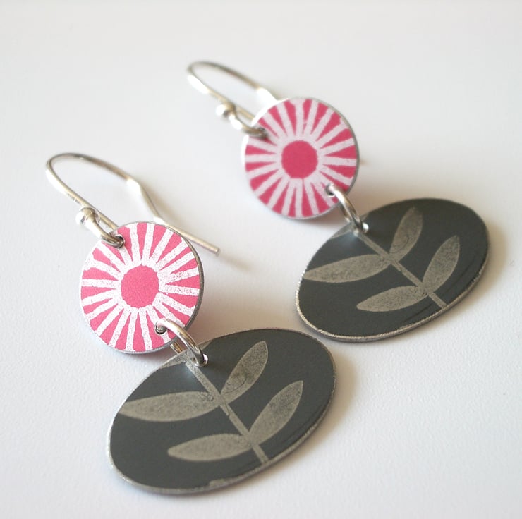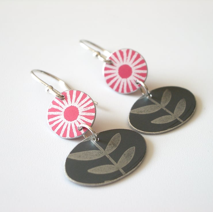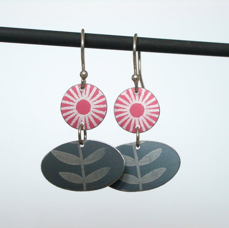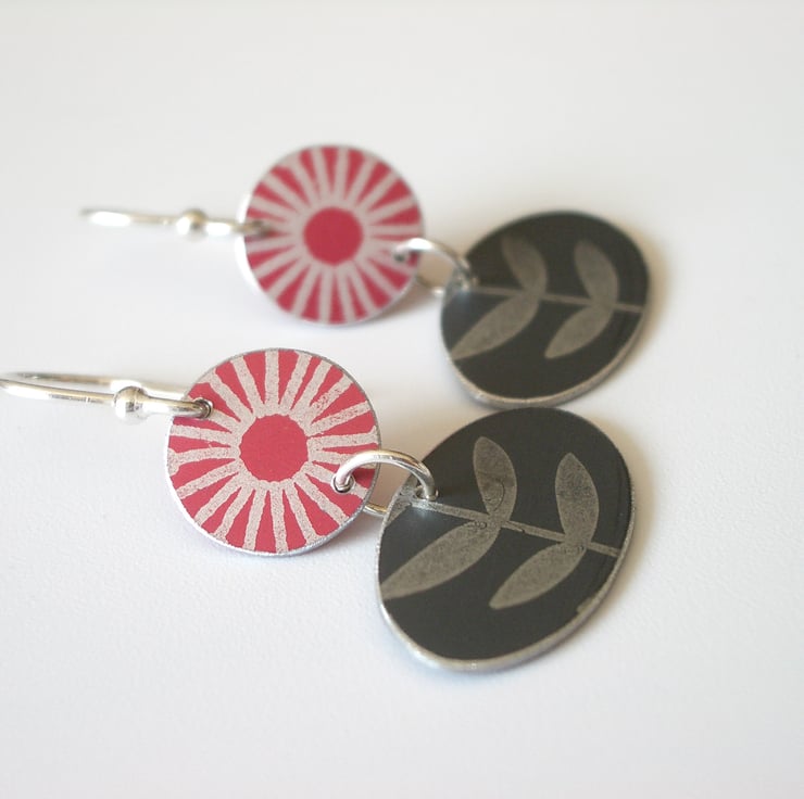 These flower and leaf earrings are inspired by scandi style folk art and are made from anodised aluminium which I have dyed in red and grey and printed with a leaf print. The dye is made permanent by heating the aluminium. I have cut out the circle and pod shape with a piercing saw and filed the edges for a nice smooth finish. The two pieces are linked with a sterling silver hoop and dangle from a sterling silver ear wire. The circle and pod shape together both measure approximately 25mm from top to bottom and the widest part of the pod measures 20mm across.