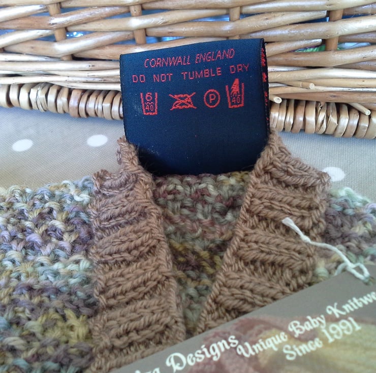 Baby knitwear is designed and hand crafted by Demelza Designs in Cornwall meeting UK baby safety standards, Only branded premuim acylic, acrylic/natural fibre blends or pure natural fibre yarns are used in baby knitwear which conforms to BS984/76 standards.