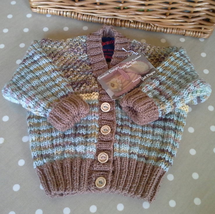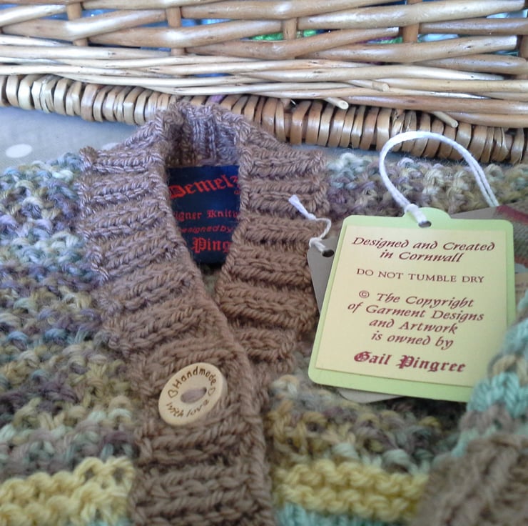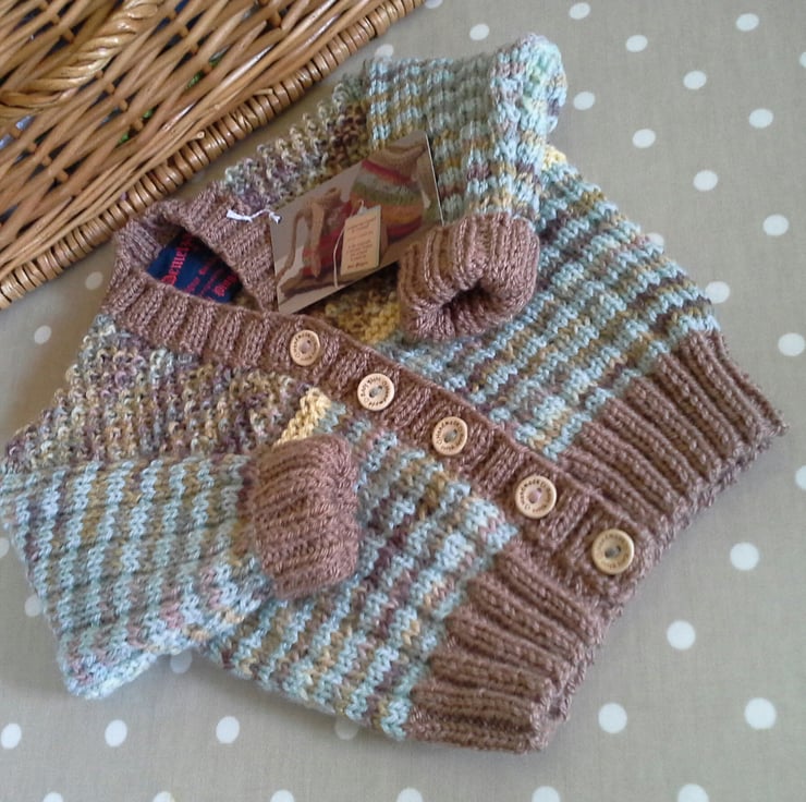 This adorable cosy hand knitted baby boys cardigan has been lovingly designed and hand crafted in Cornwall using quality branded machine washable British and Turkish manufactured yarns. The multicoloured yarn has a 35% Marino Wool content for added warmth and luxury. The solid coloured yarns are premium branded British manufactured yarns. The buttons are made from genuine wood with a sweet sentiment burnt etched on them.