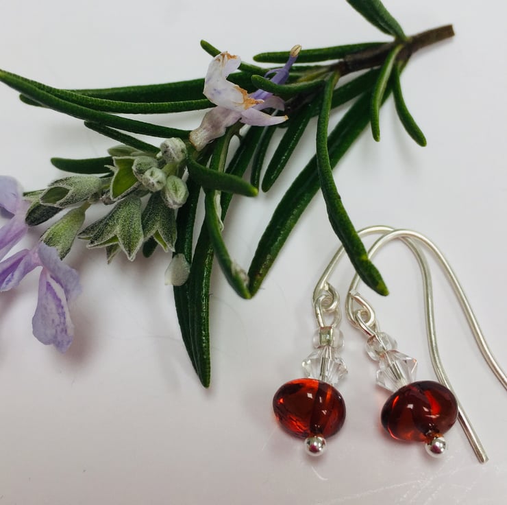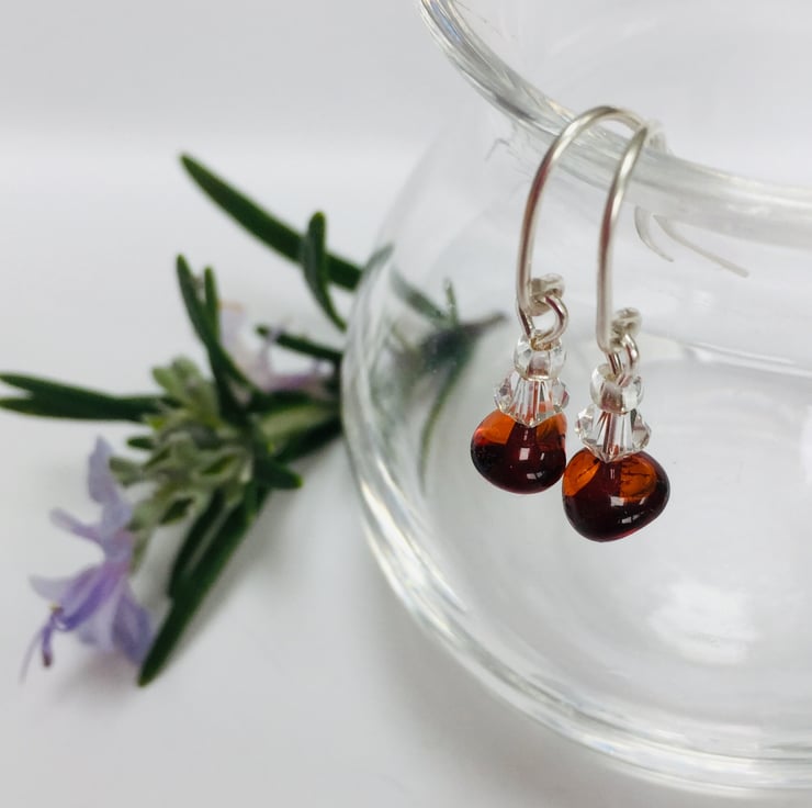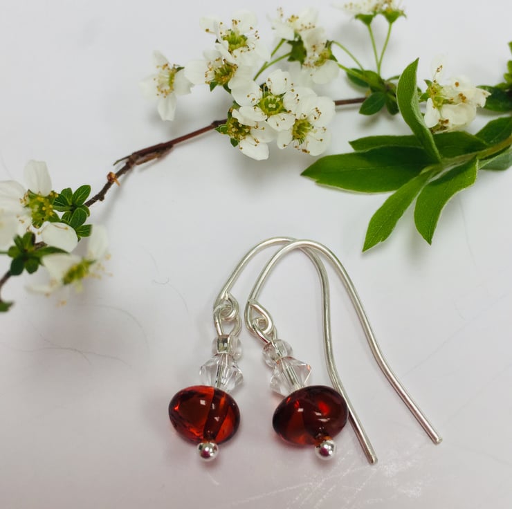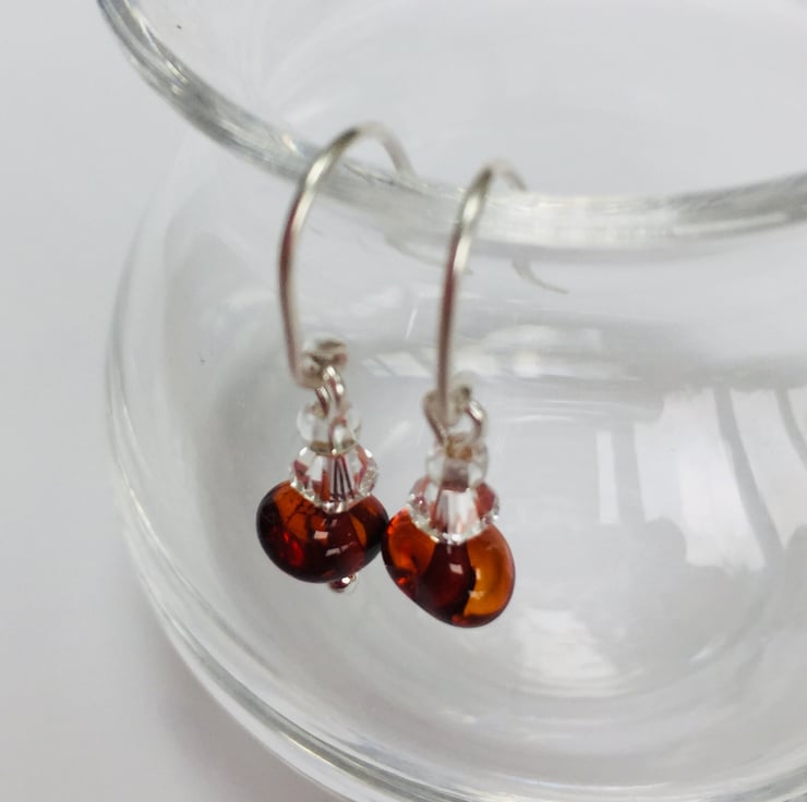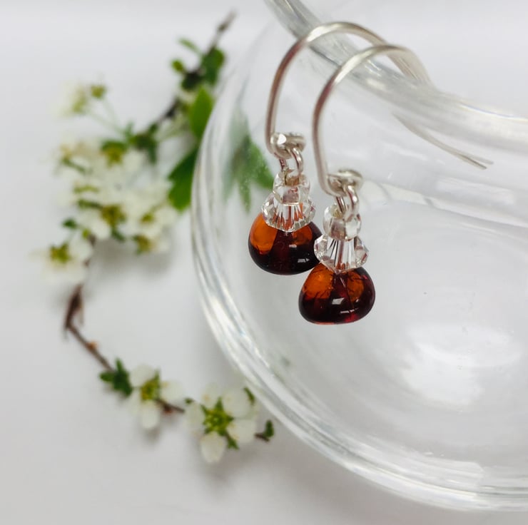 These pretty earrings are created from sterling silver with stunning amber gemstones and Swarovski crystals. The hooks are also hand crafted in sterling silver. Perfect for any occasion.